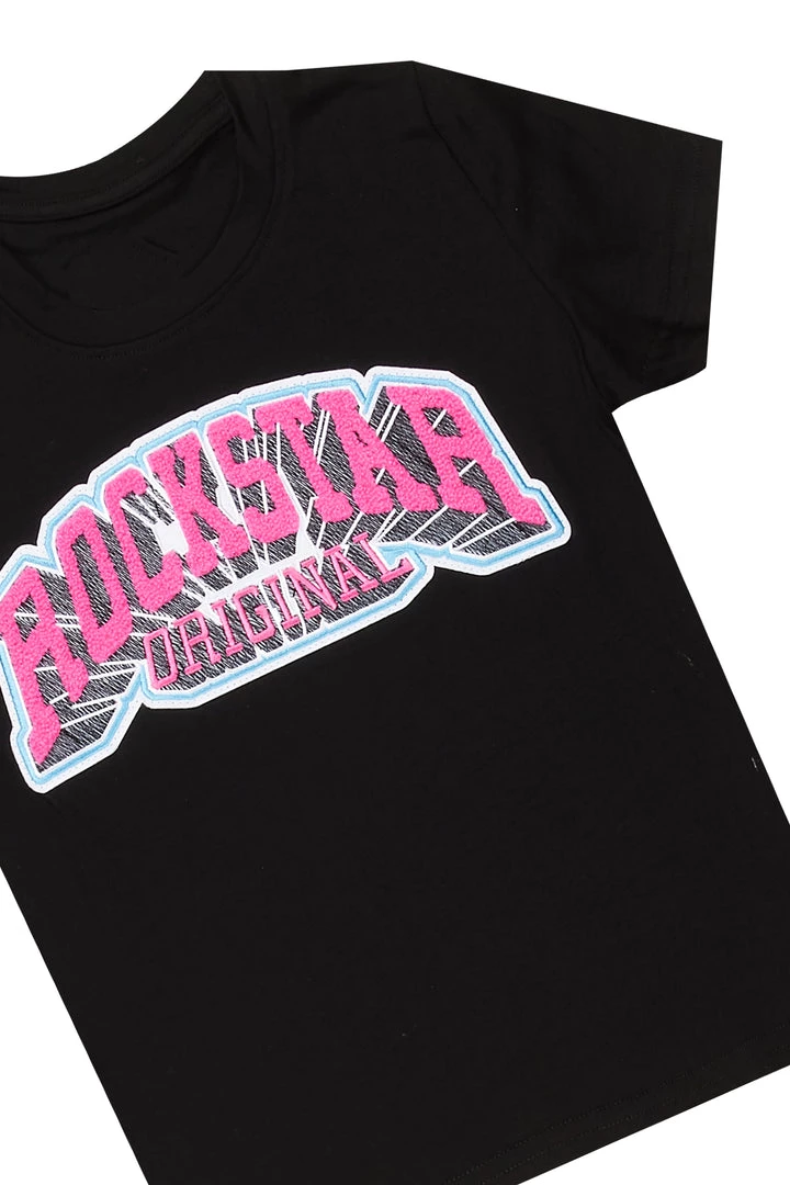 Rockstar Original Boy’s two-piece denim set. Featuring embroidered RSO logos on the top and bottoms. Top accents a crew neckline with a relaxed fit while bottoms accent a front button closure with a high quality coin pocket and distressed details throughout.