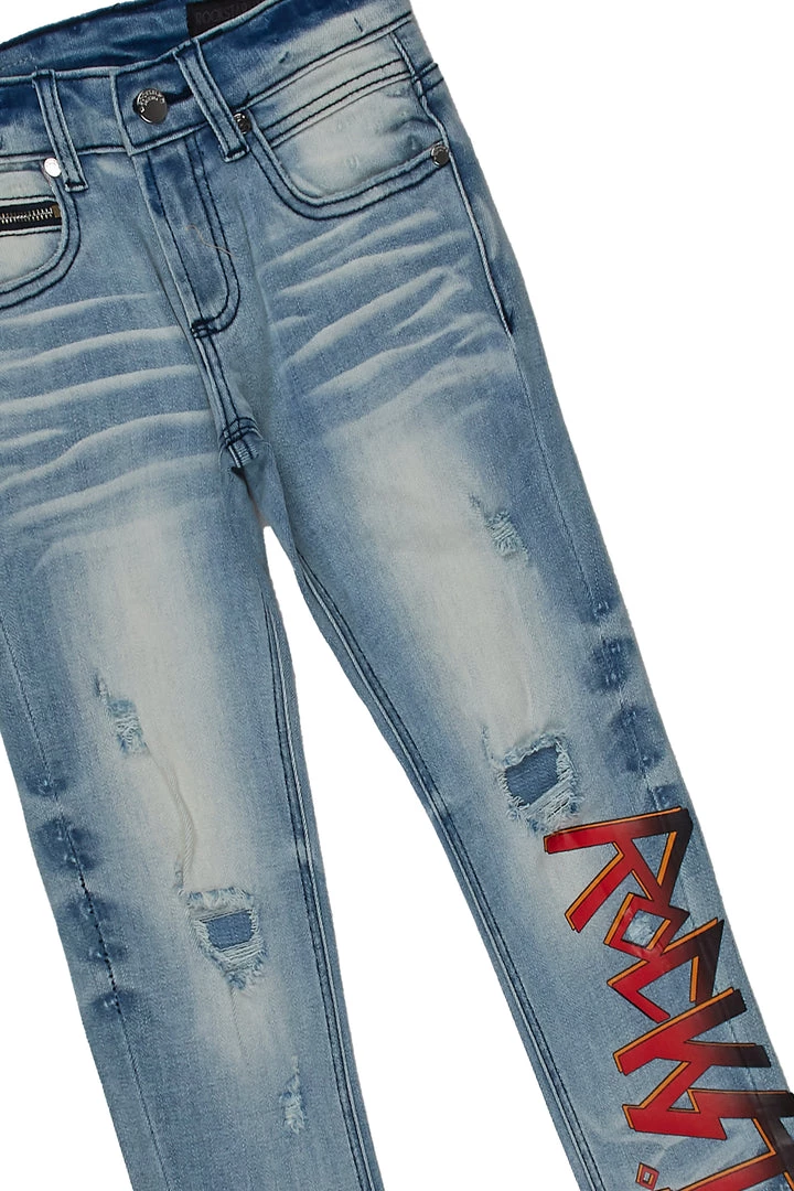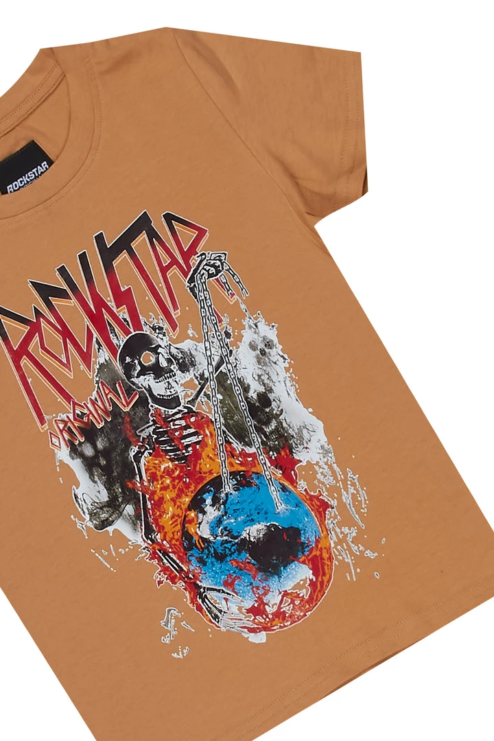 Rockstar Original Kid’s denim set in beige and light wash. Featuring printed RSO logos with graphics to match on the top and bottoms. Top accents a crew neckline with a relaxed fit while bottoms accent distressed detailing, a high quality zipper coin pocket and front button closure. Your ‘Lil Rockstar will look good and feel better all day long!