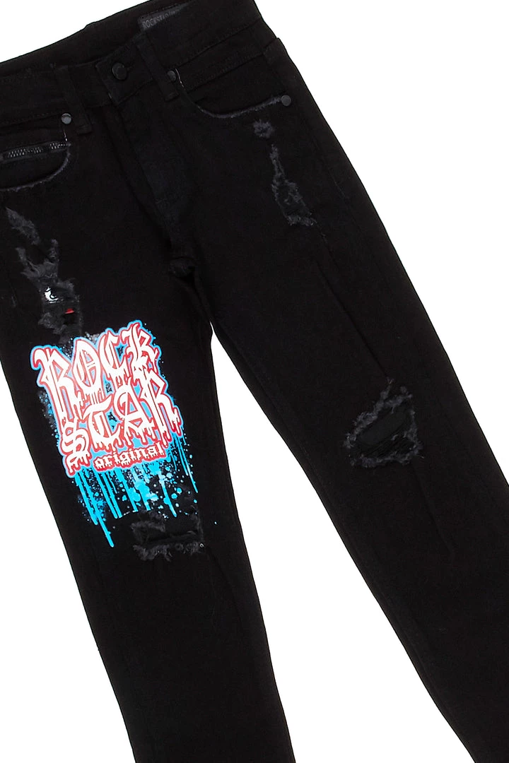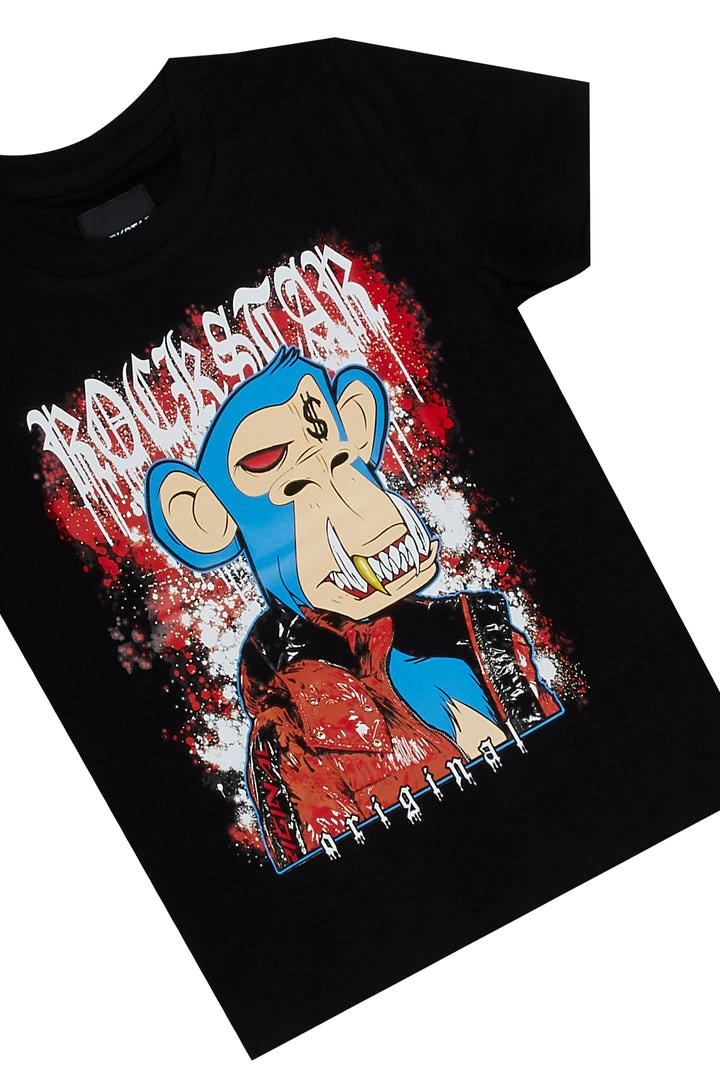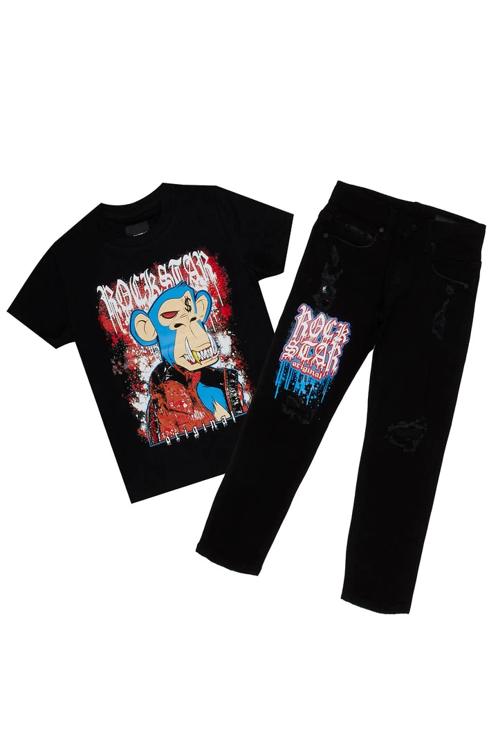 Rockstar Original Boy’s two-piece denim set in black. Featuring printed RSO logos on the top and bottoms with a multi color NFT graphic on the top. Tee accents a crew neckline with a relaxed fit while bottoms accent a front button closure with a high quality coin pocket and distressed details throughout.