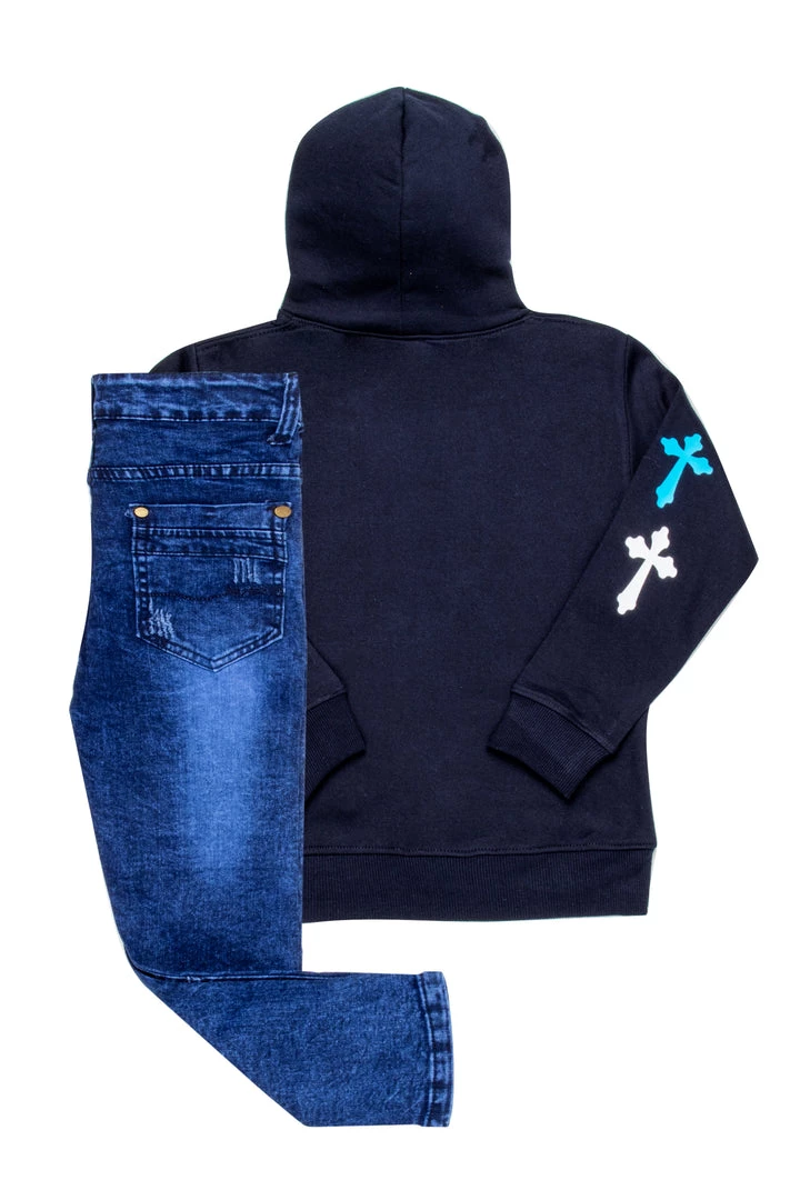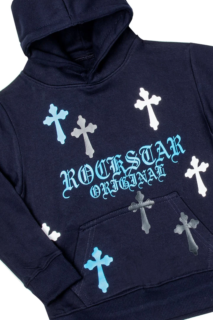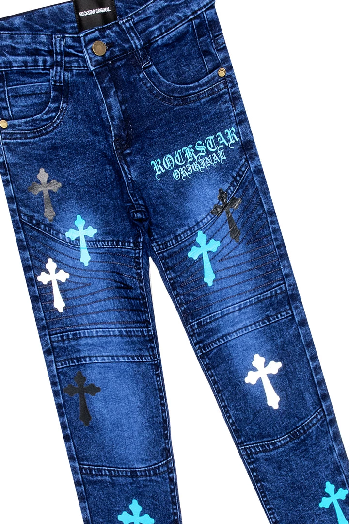 Rockstar Original Boy’s two-piece denim set in navy. Featuring printed RSO logos with graphics to match on the top and bottoms. Top accents a fitted hem with a front pocket while the bottoms accent distressed styling, a high quality button closure and signature moto biker styled stitching.