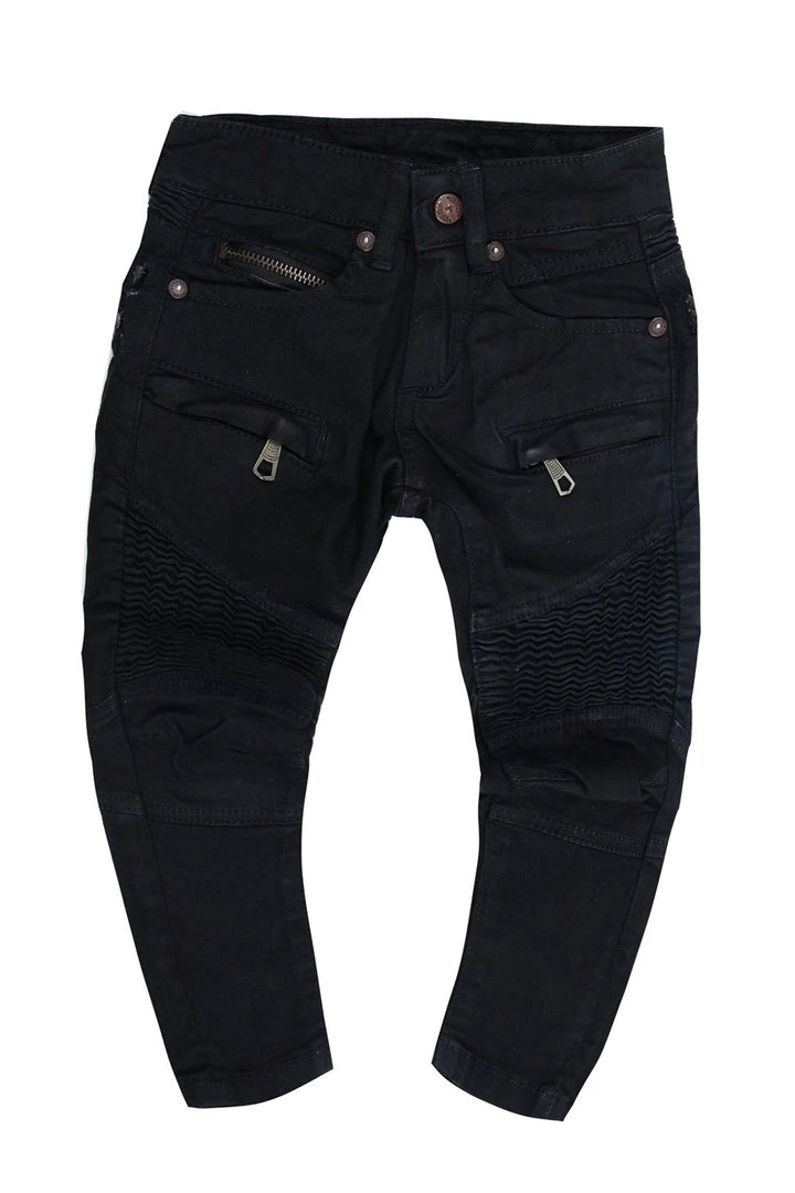 Rockstar Original Boy’s denim jean in black. Featuring a signature moto biker design with a coin pocket and high quality front button closure. These jeans accent premium cotton threading for a comfortable style that will move with your ‘Lil Rockstar all day!