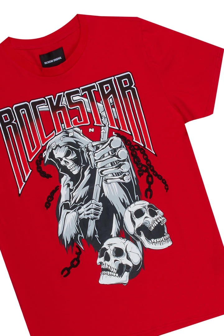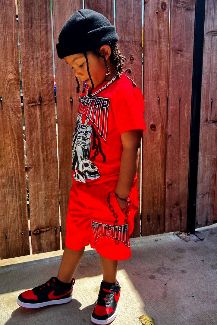 Rockstar Original Boy’s two-piece short set in red. Featuring an embroidered RSO logo and embroidered details to match on the top and bottom. Top accents a printed graphic with a crew neckline and stretch material while bottoms accent a drawstring waistband, high quality zipper pockets and inner mesh lining.