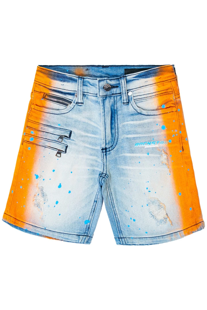 Rockstar Original boy’s shorts featuring graffiti highlights on sides with paint splatter details. Distressed details and a graphic printed RSO logo. High quality zipper coin pocket.