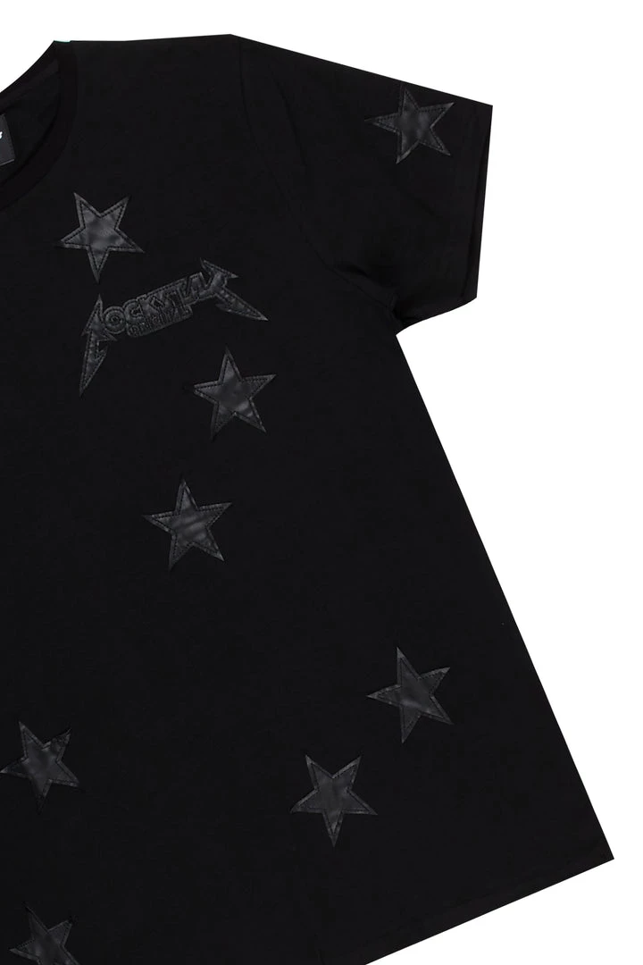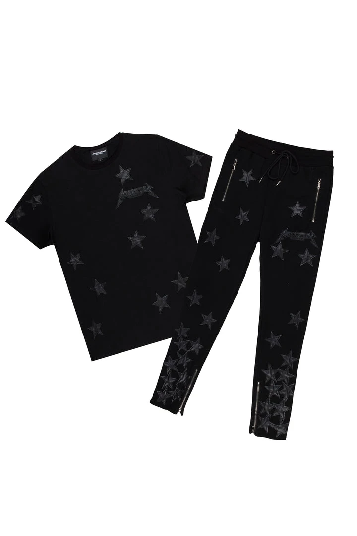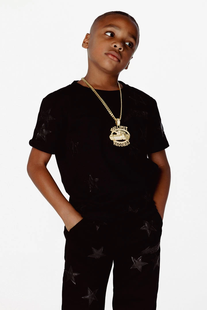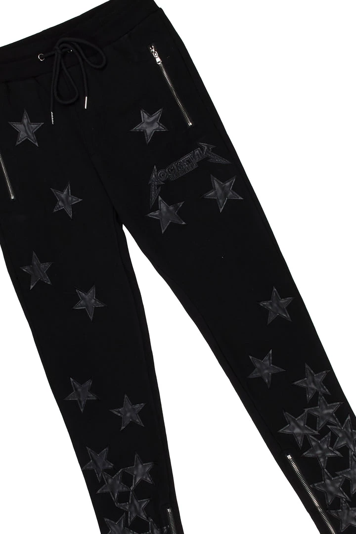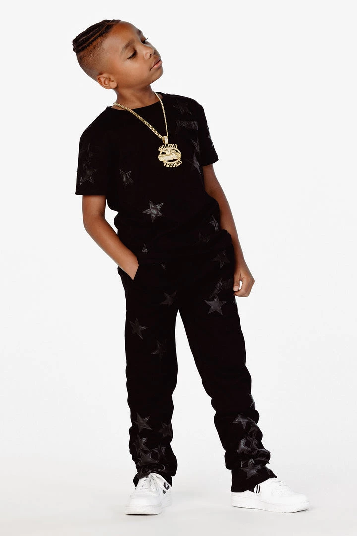 Rockstar Original Kid’s track set in black. Featuring embroidered faux leather RSO logos with star graphics to match on the top and bottoms. Top accents a crew neckline with a relaxed fit while bottoms accent a drawstring waistband with high quality zipper pockets and ankle zipper inseams.