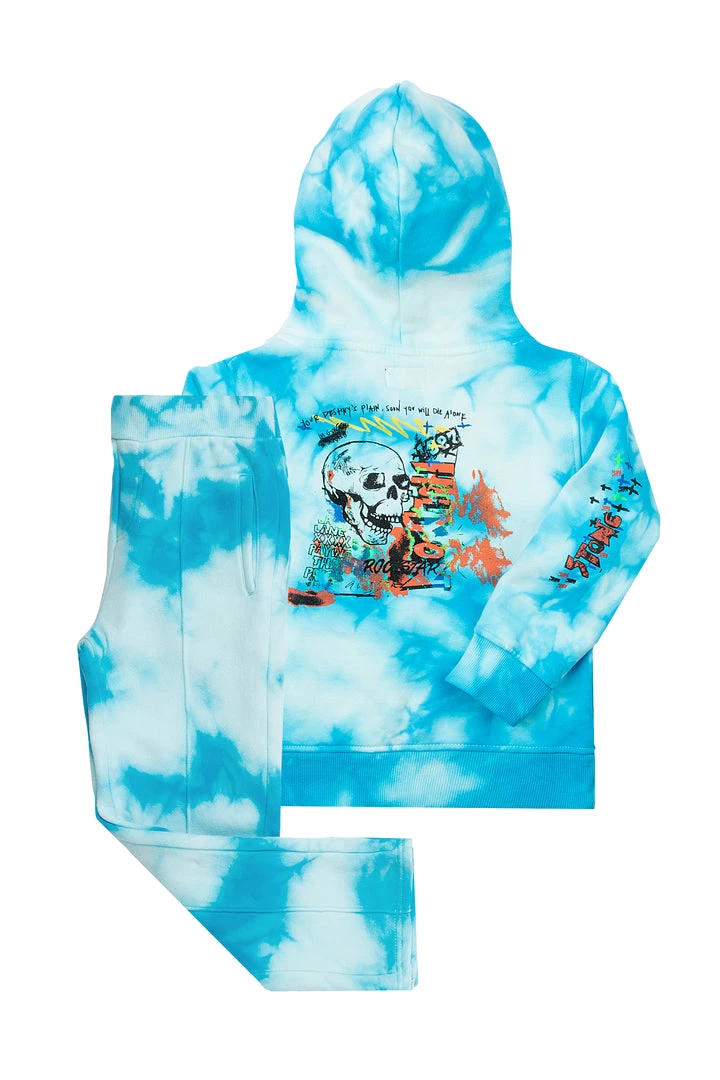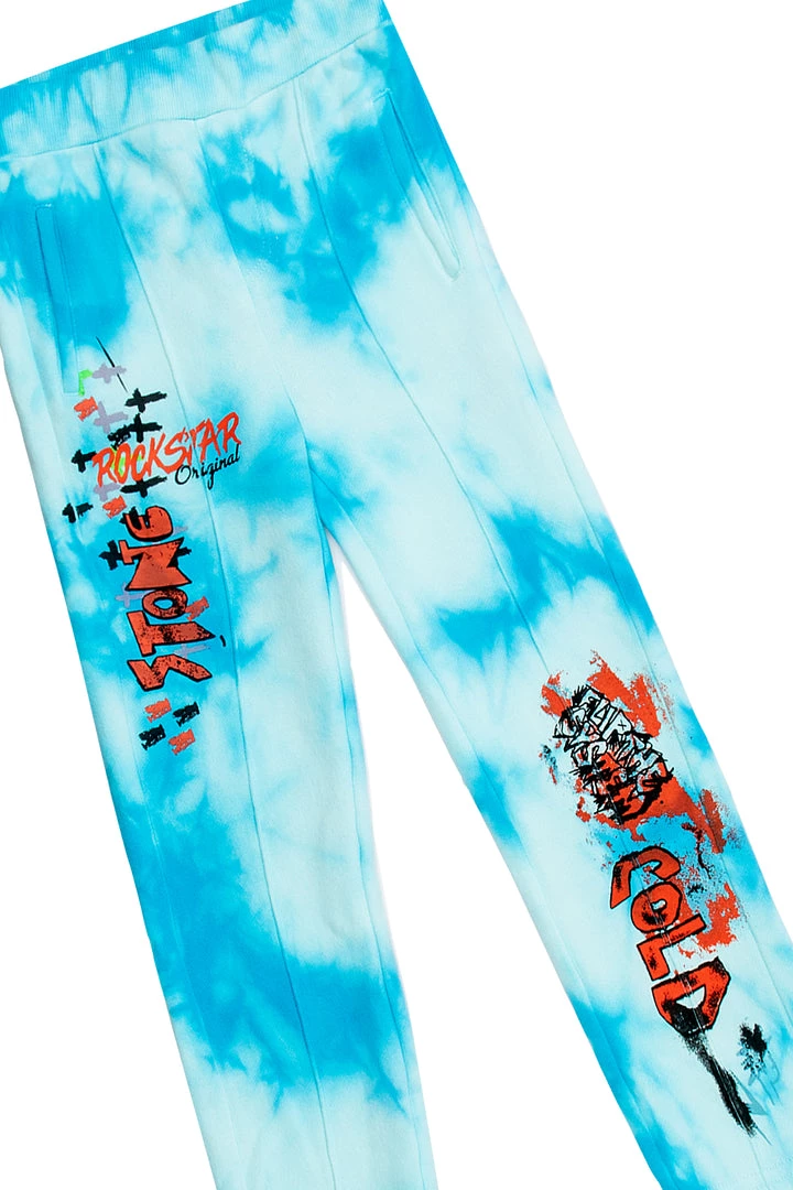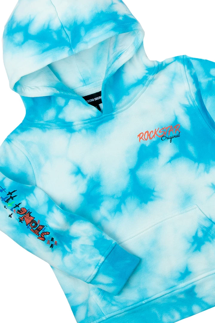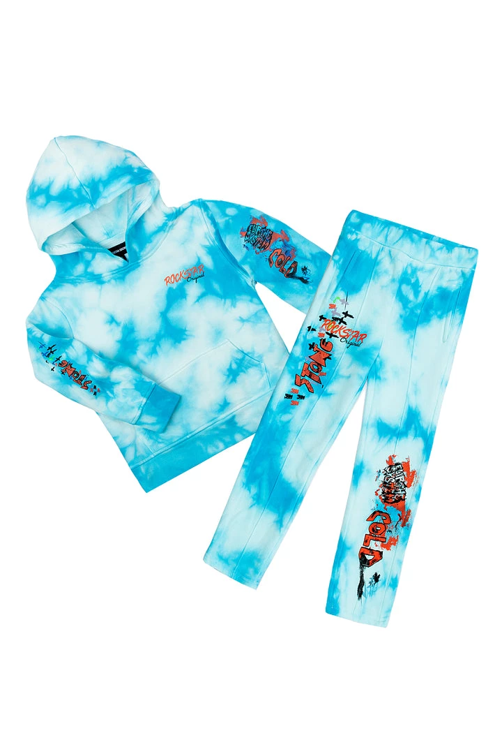 Rockstar Original Kid’s two-piece tracksuit set in blue marble tie dye wash. Featuring a printed RSO logo with multi color graphics to match. This must-have accents a front pocket on the top while the bottoms accent a relaxed fit with an elastic waistband, side pockets and premium cotton threading for all day comfort.