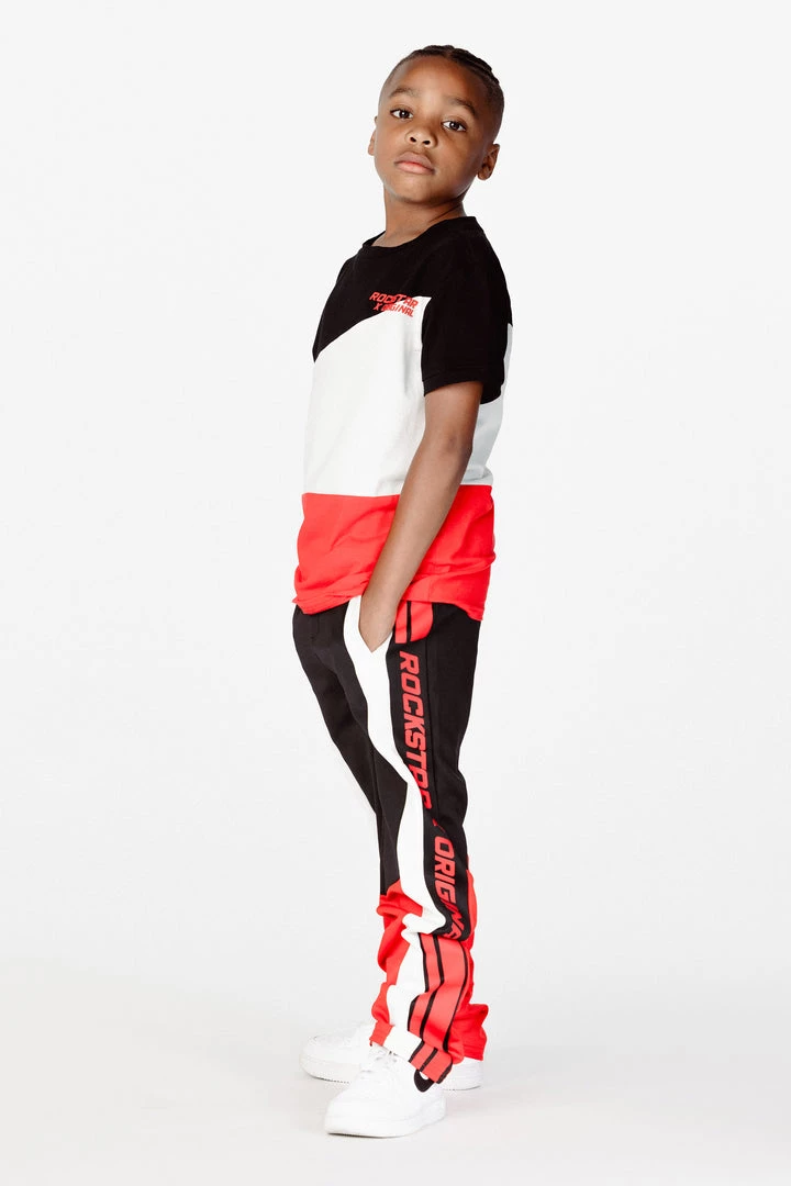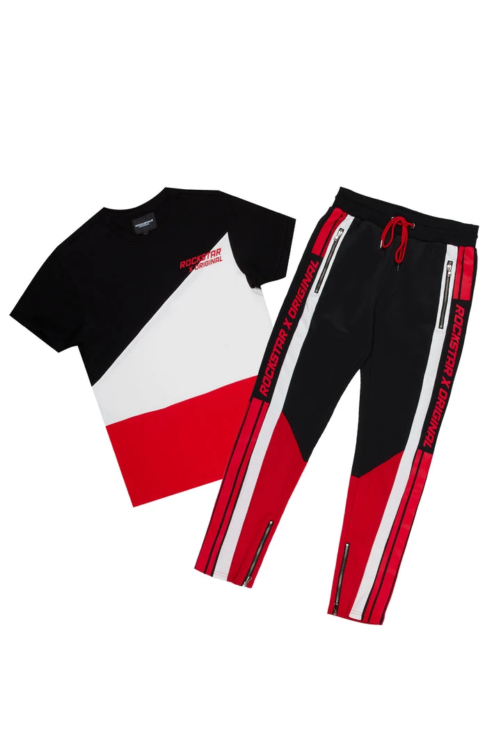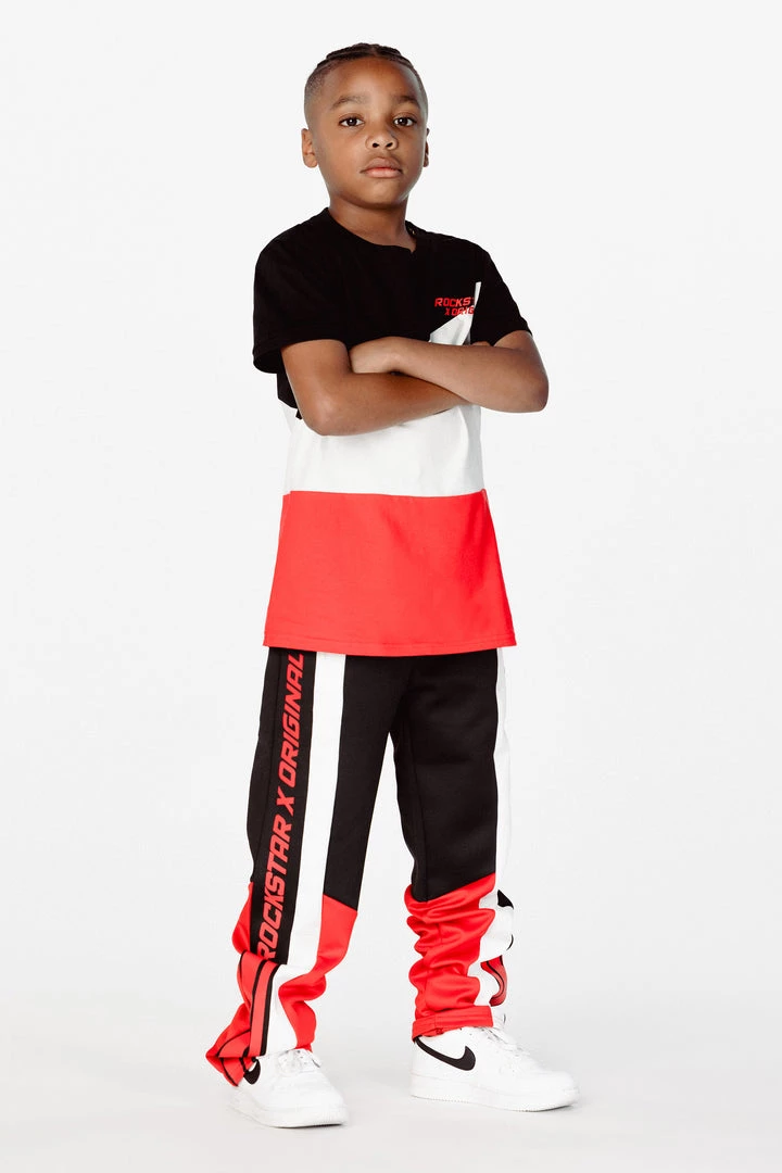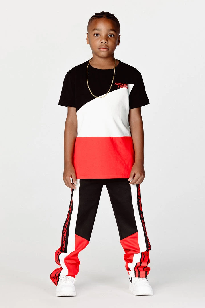 Rockstar Original Boy’s two-piece tracksuit set in black. Featuring printed RSO logos and color block designing throughout. Top accents a crew neckline with short sleeves and a relaxed fit while bottoms accent a drawstring waistband, high-quality zipper pockets and ankle zipper inseams.