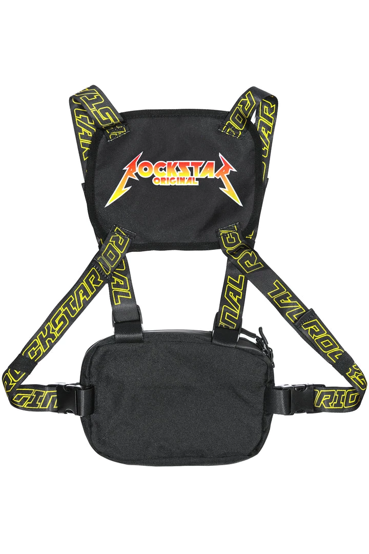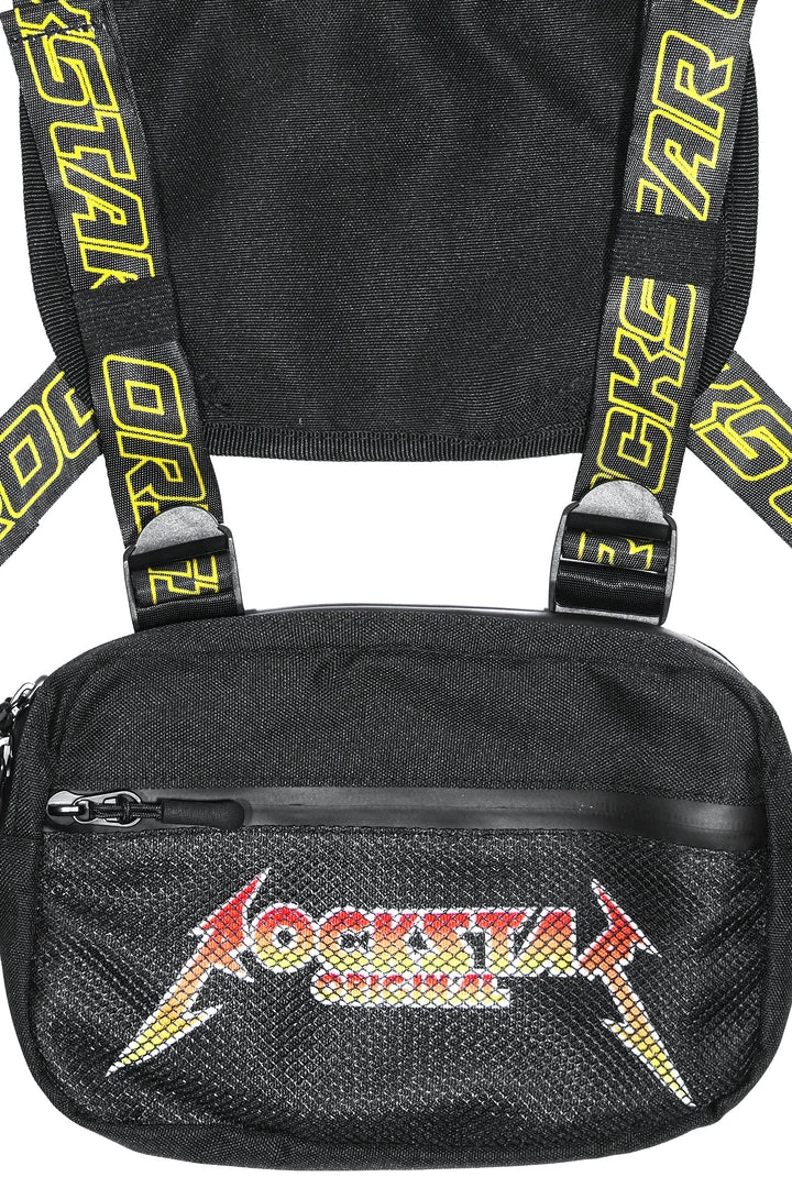 Rockstar Original men’s chest bag featuring adjustable RSO straps with buckle clasps. Two tone graphic printed RSO logo with zipper with mesh pockets.