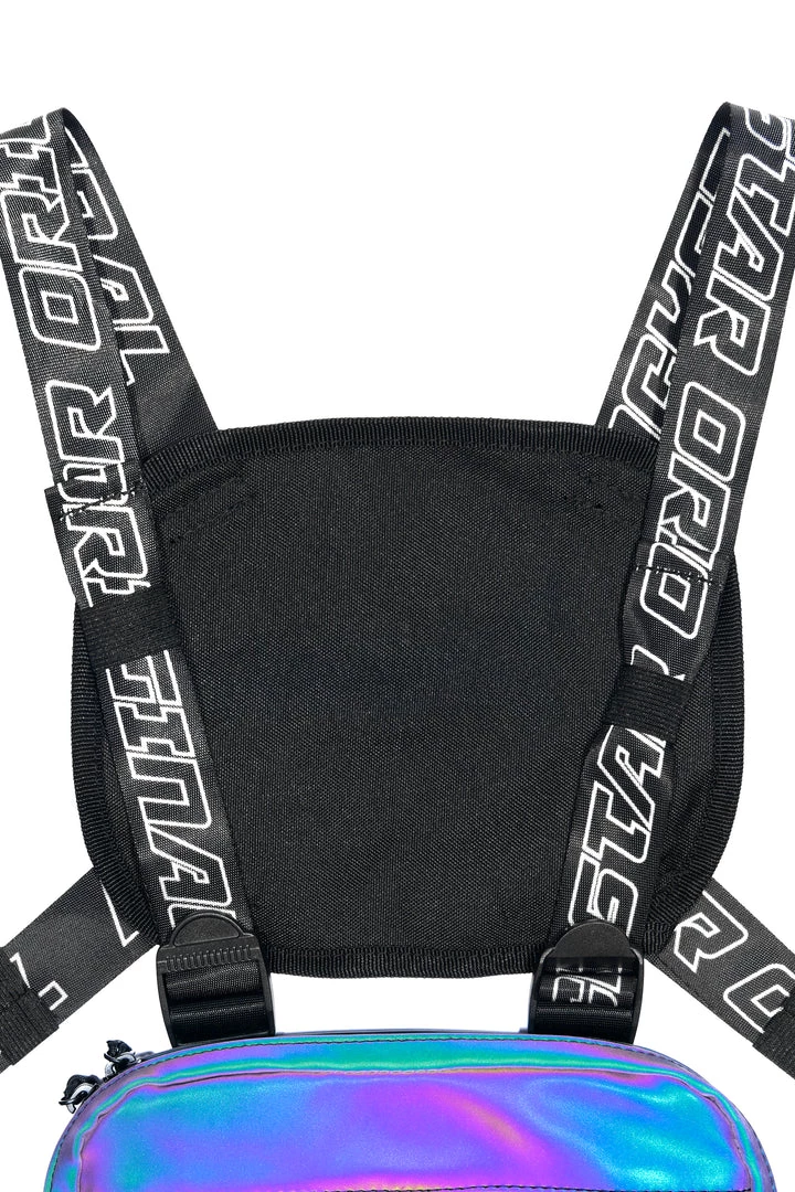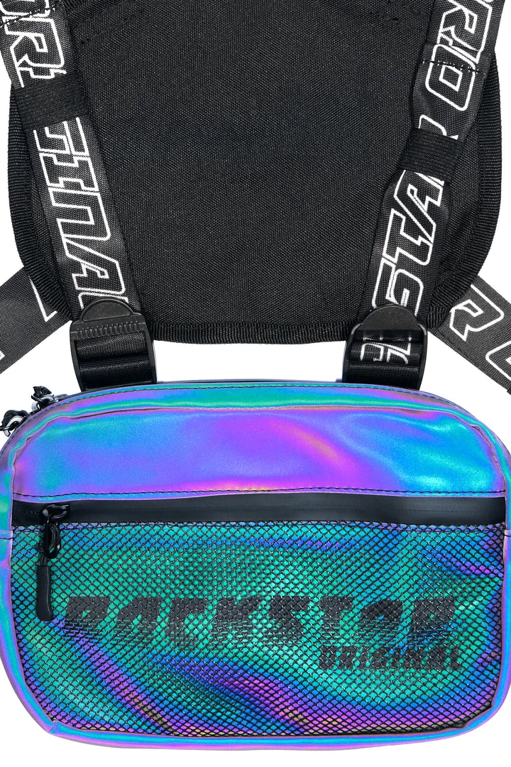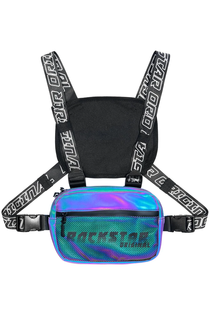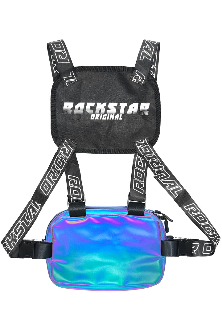 Rockstar Original men’s chest bag featuring adjustable RSO straps with buckle clasps. Graphic printed RSO logo with zipper with mesh pockets.