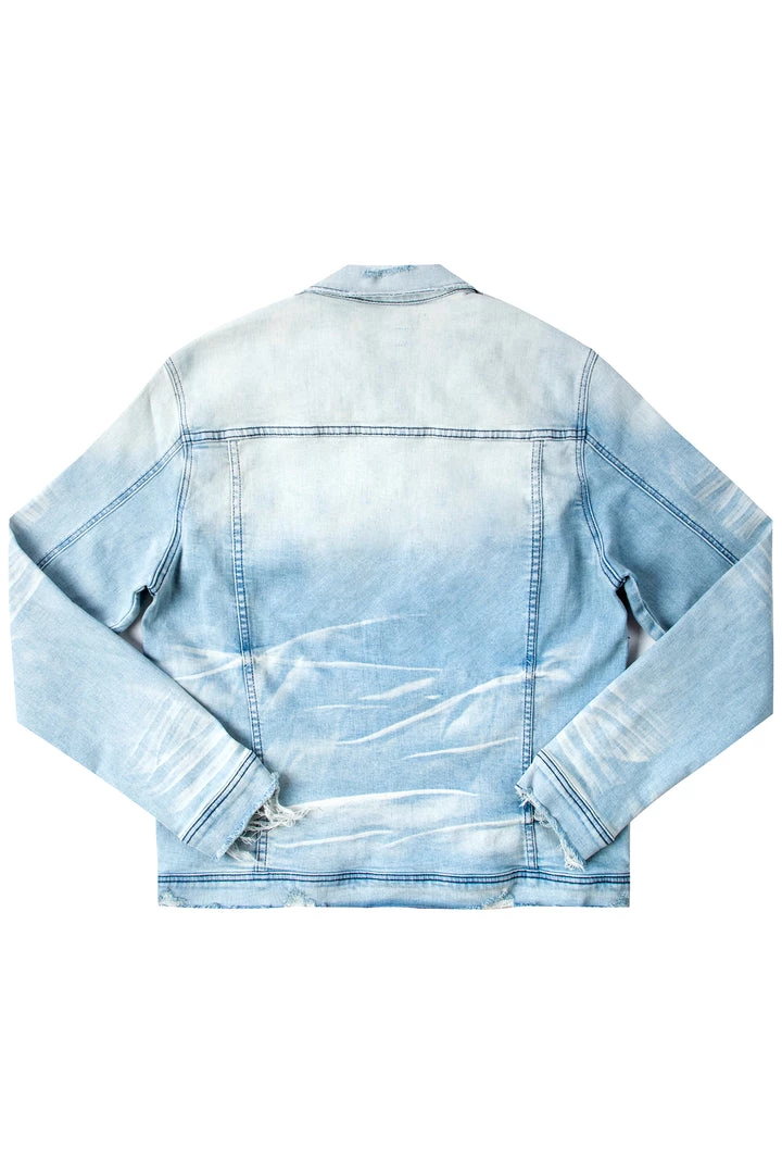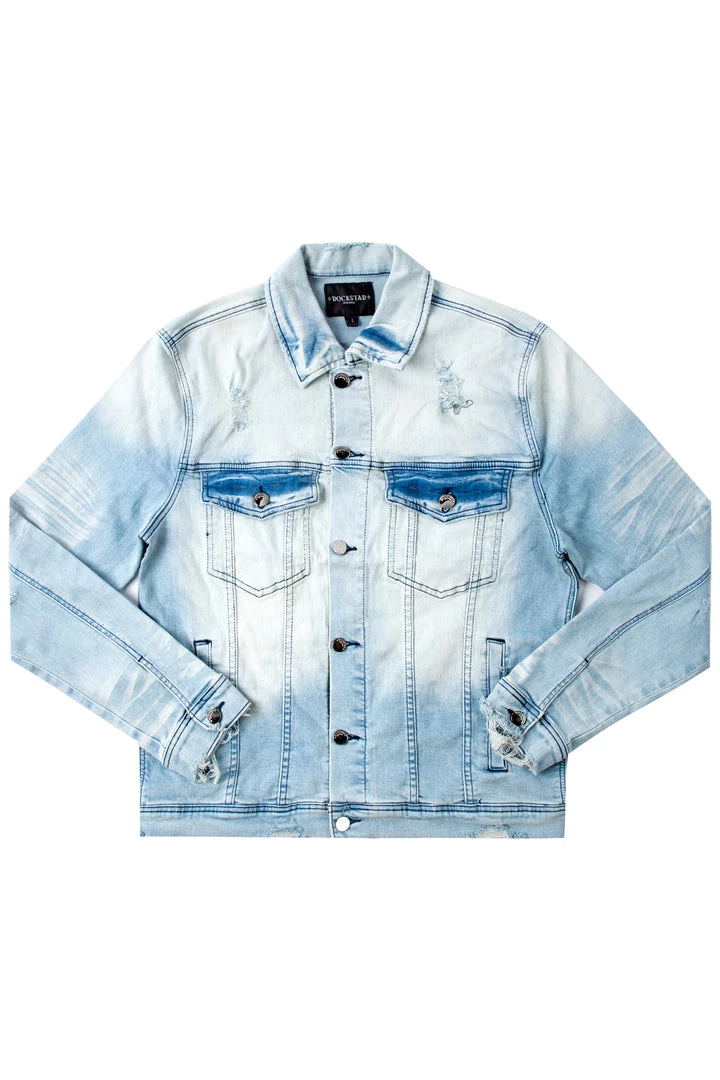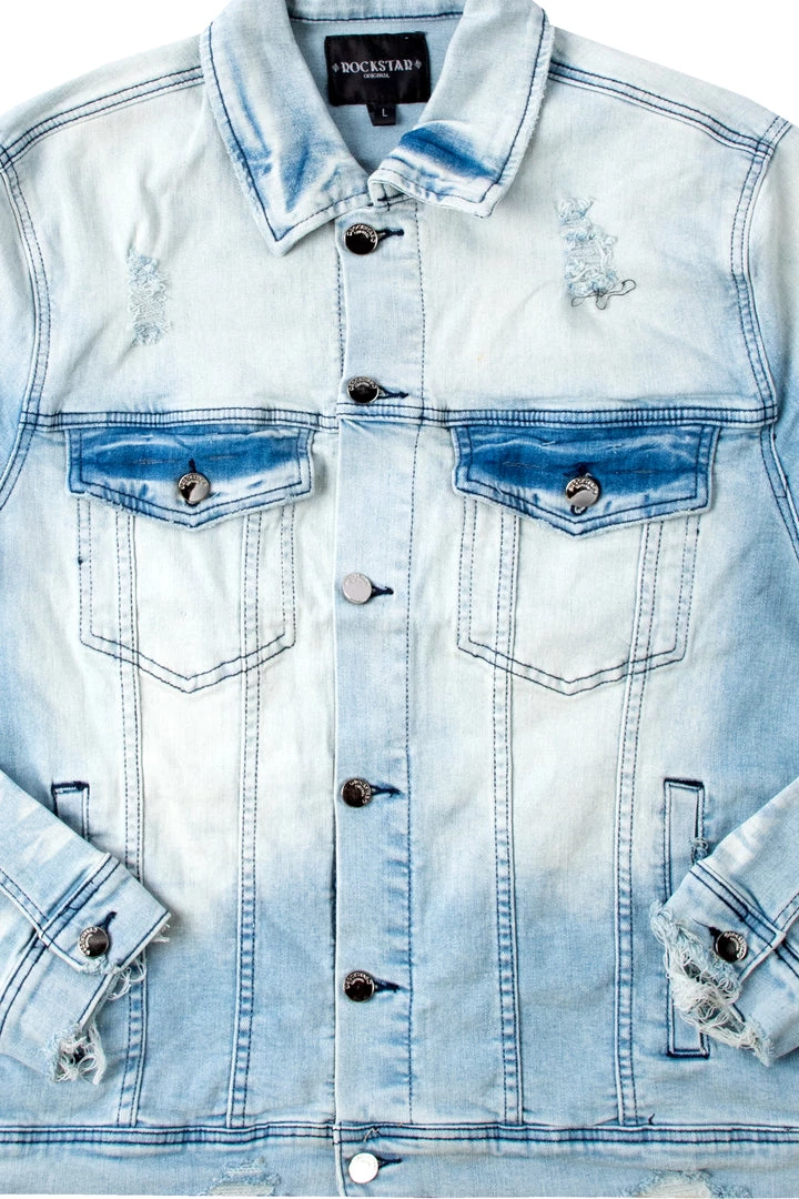 Rockstar Original men’s jacket featuring a light wash with distressed details all throughout. High quality button down closure with two front pockets.