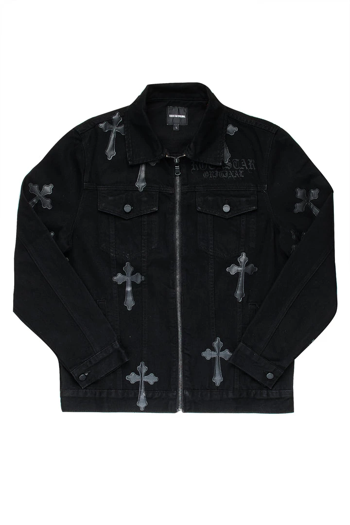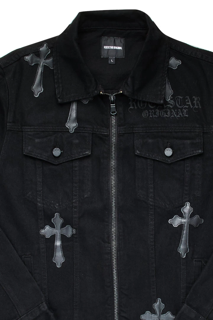 Rockstar Original Men’s denim jacket in black. Featuring a printed RSO logo with embroidered cross graphics throughout. This must-cop denim jacket accents a collared neckline with a high quality front zipper closure, dual chest pockets and premium cotton threading for all day comfort.