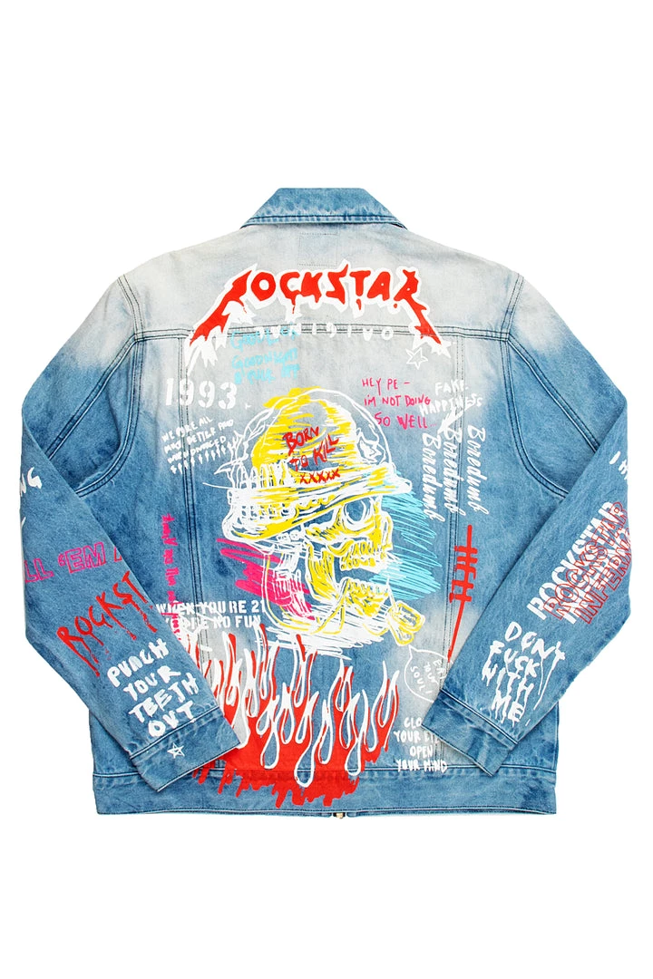 Rockstar Original Men’s denim jacket in light wash. Featuring a custom painted posterior RSO logo with custom paint designing throughout. This unique denim jacket accents a collared neckline, side pockets, two chest button pockets and a high quality zipper closure with buttoned cuffs. Designed with premium cotton threading for comfort and durability.