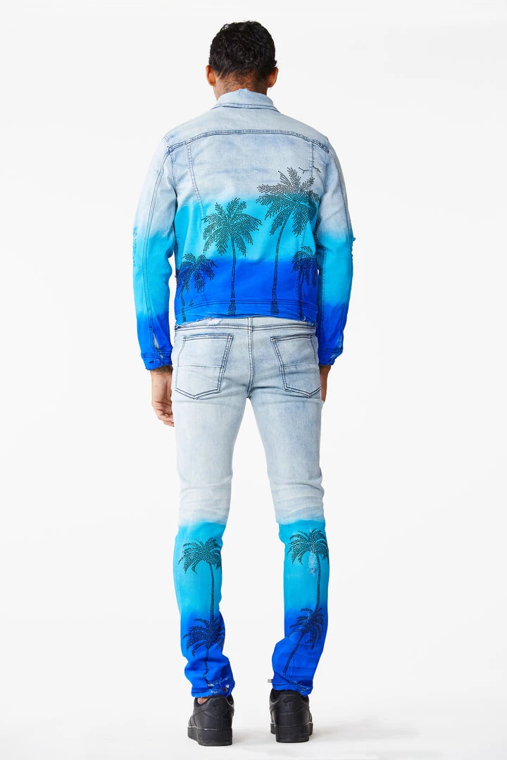 Rockstar Original men’s jacket featuring a crystal designed palm tree and RSO logo. Two tone ombre colors. Zipper down closure with two chest pockets.