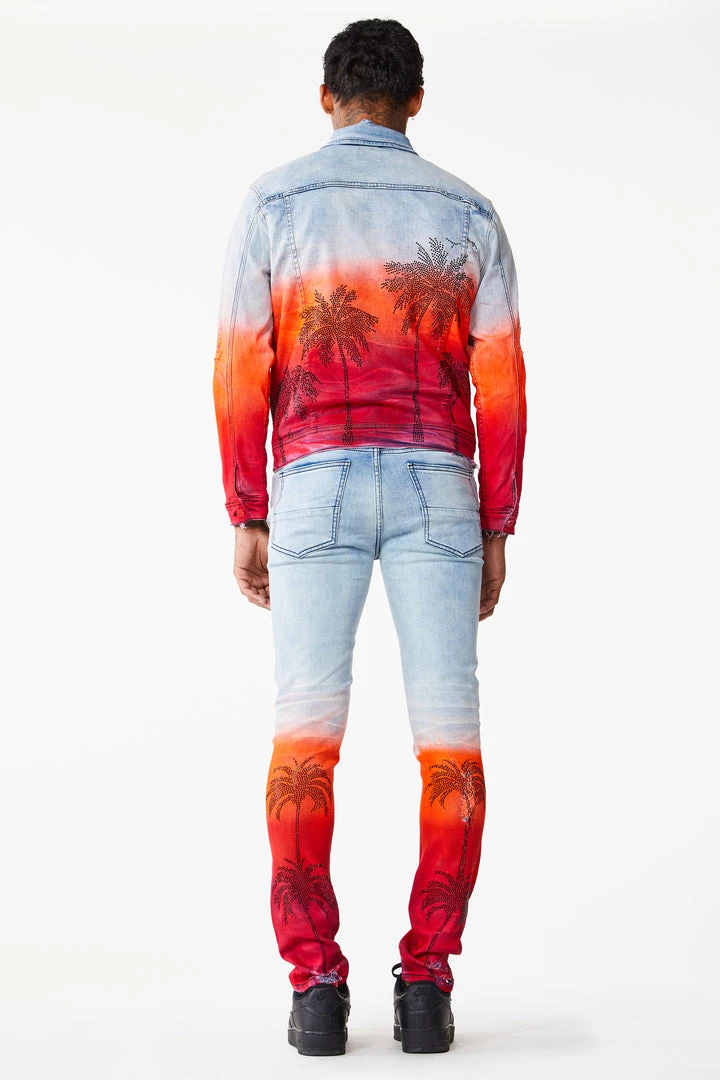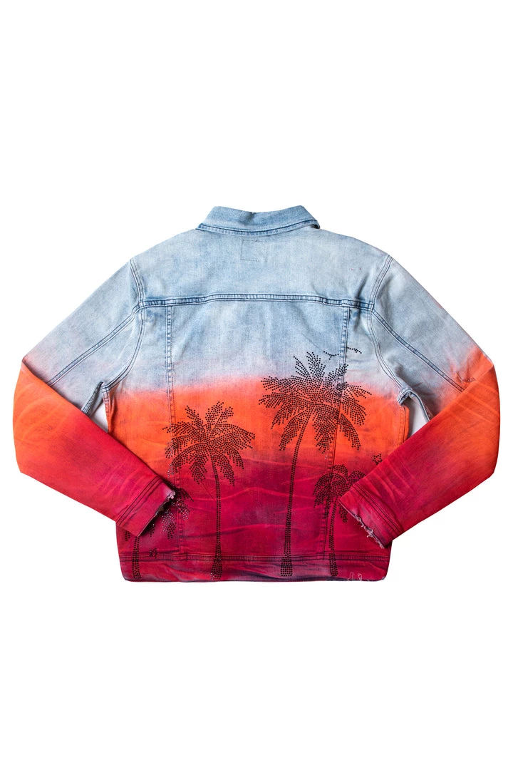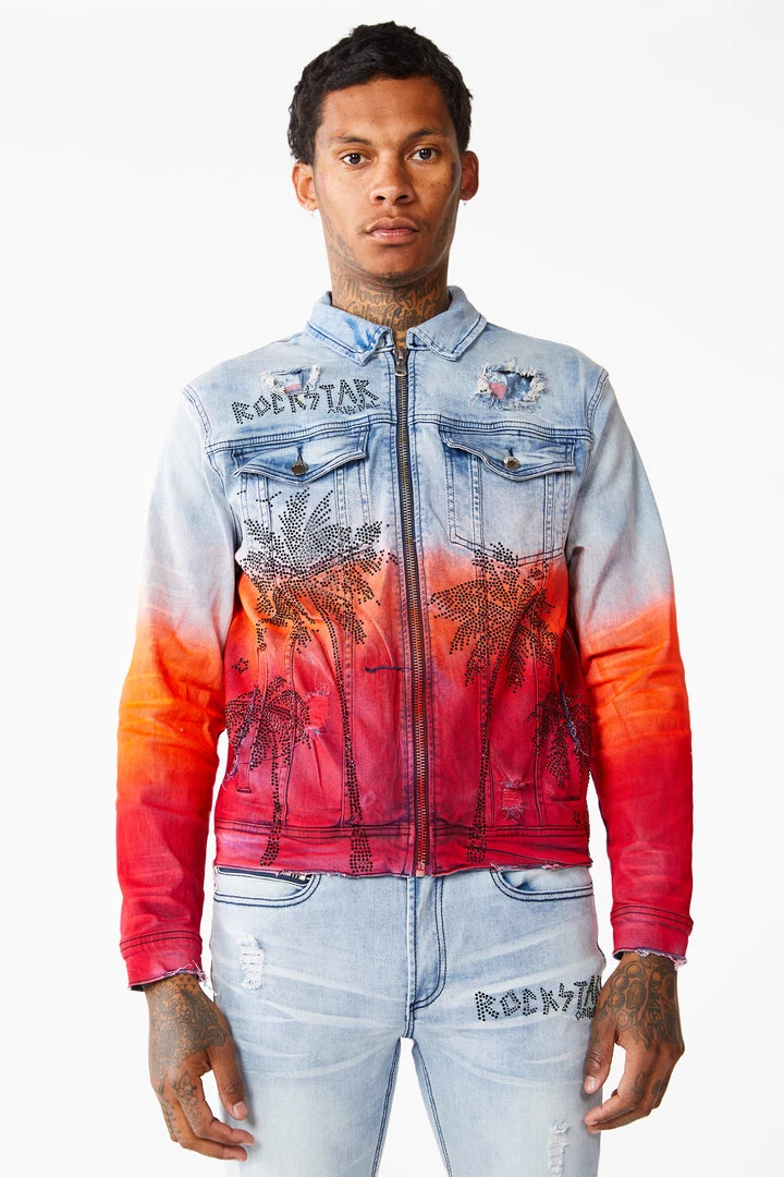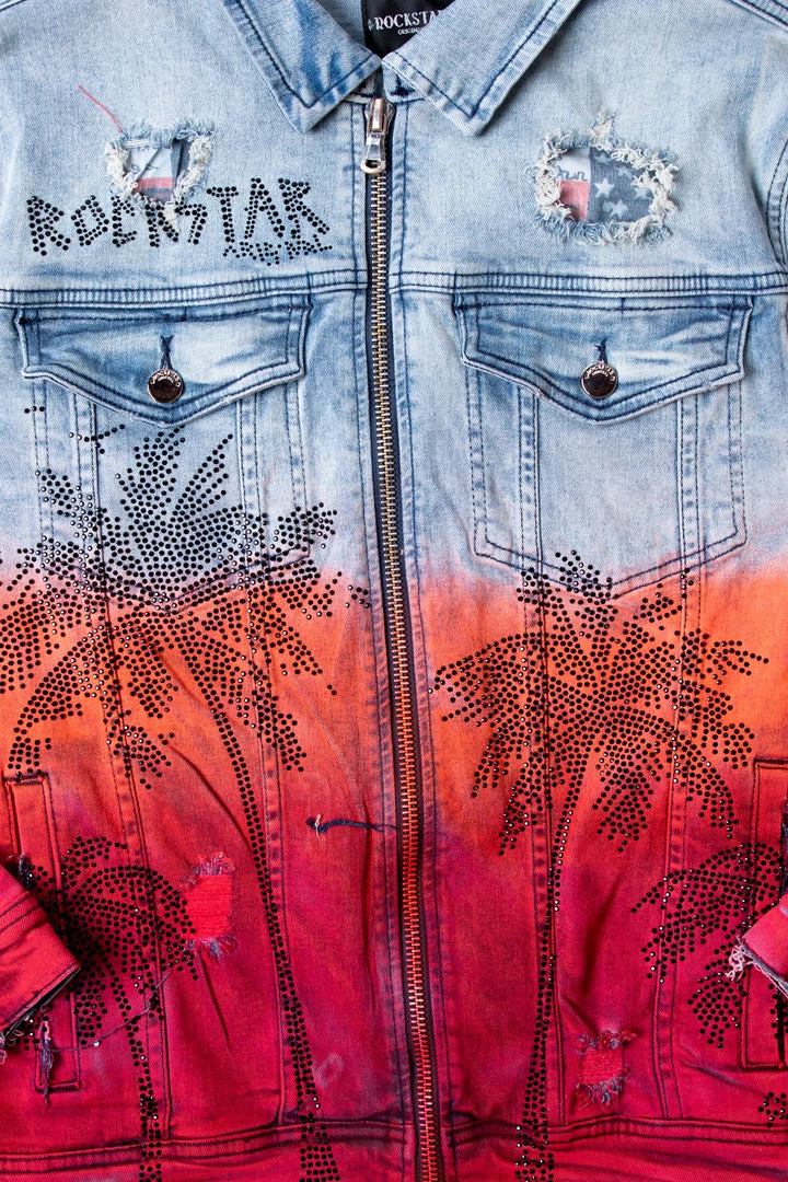 Rockstar Original men’s jacket featuring a crystal designed palm tree and RSO logo. Two tone ombre colors. Zipper down closure with two chest pockets.