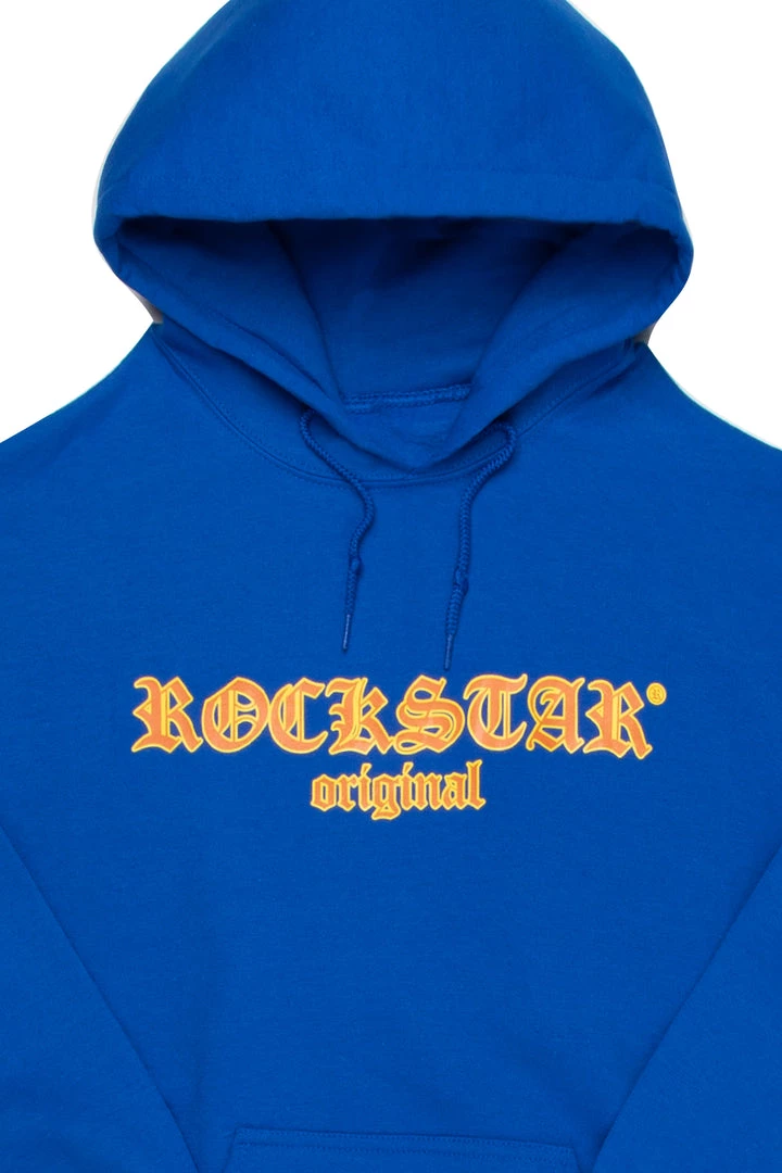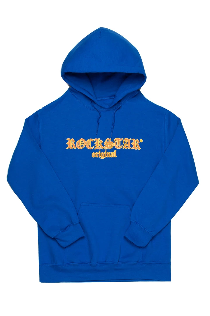 Rockstar Original Men’s hoodie in royal blue. Featuring a printed RSO logo in classic Old English and paisley printed graphics to match. Accenting a drawstring hood, front pocket, cuffed hems and premium cotton threading for all day comfort.