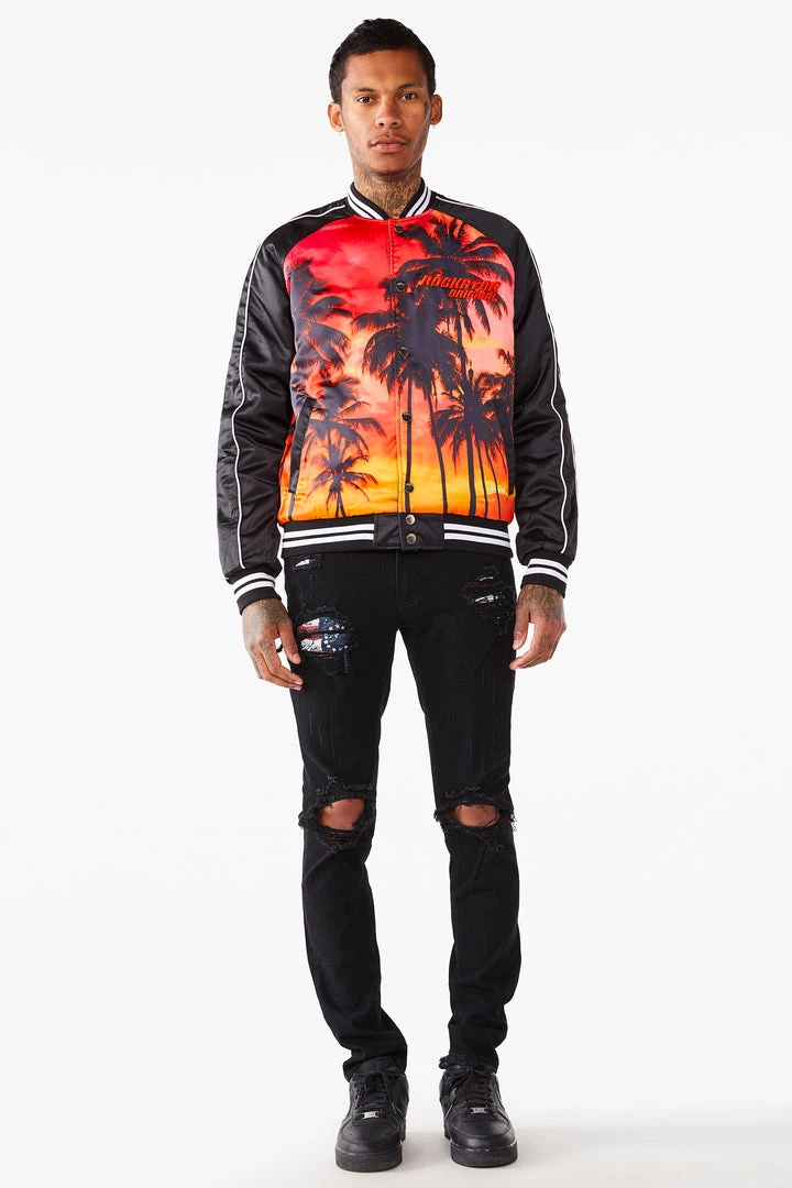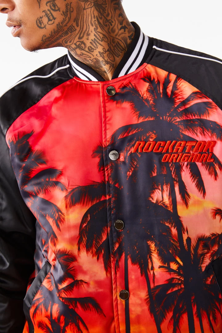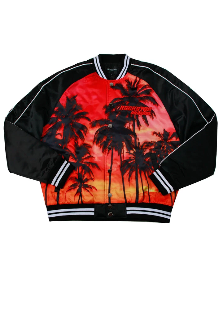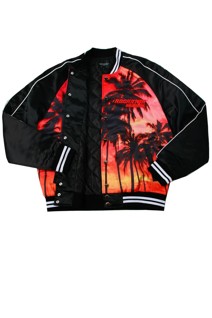 Rockstar Original men’s jacket features a palm tree graphic prints all throughout with stripe details. Bomber design with nylon mesh lining. High quality button down closure.