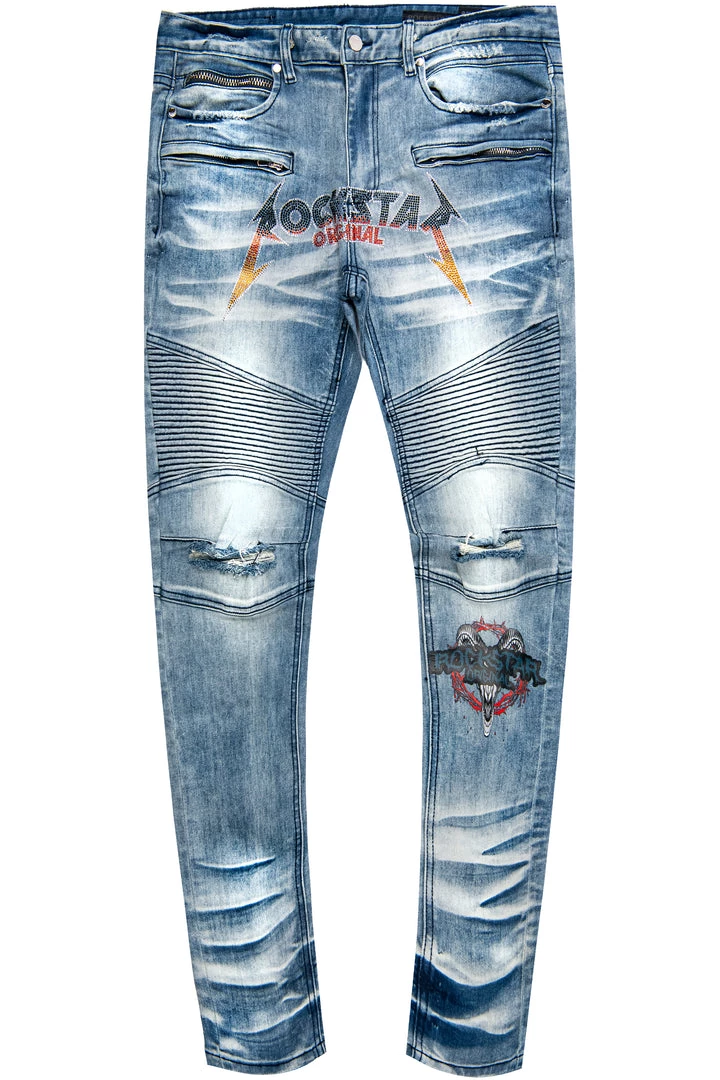 Rockstar Original Men’s denim featuring a crystal designed RSO logo with graphic print at knee. Signature moto biker design with destroyed details at knee with a high quality zipper coin pocket.