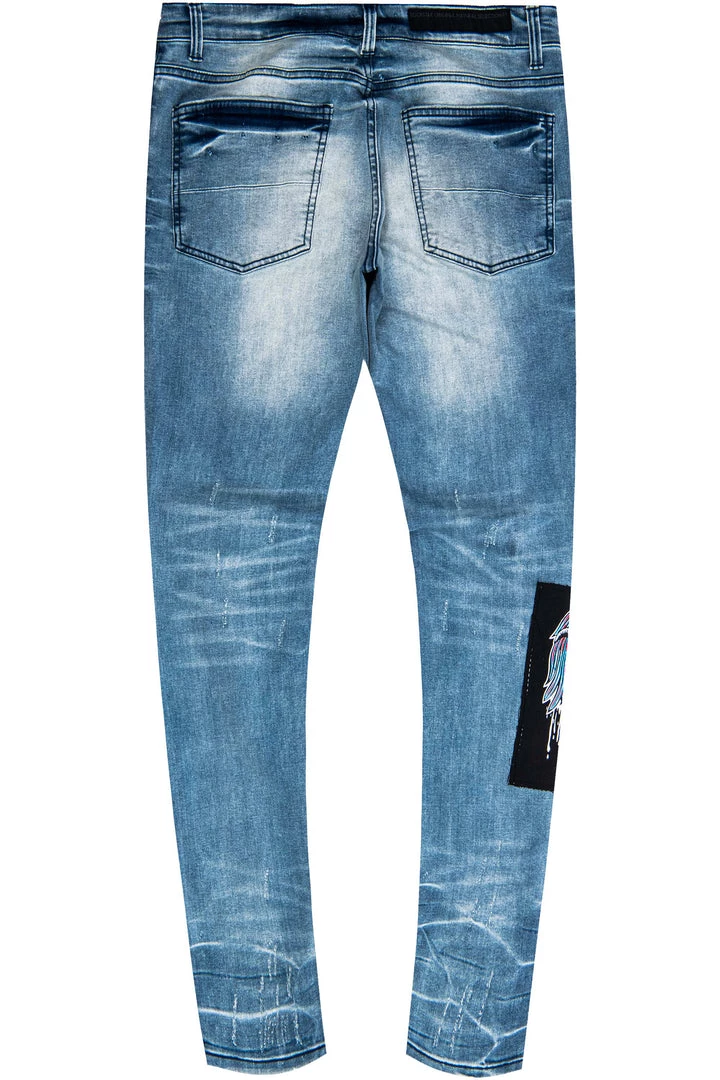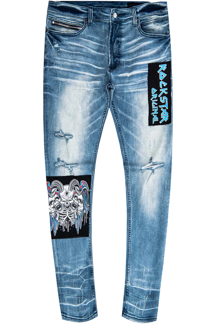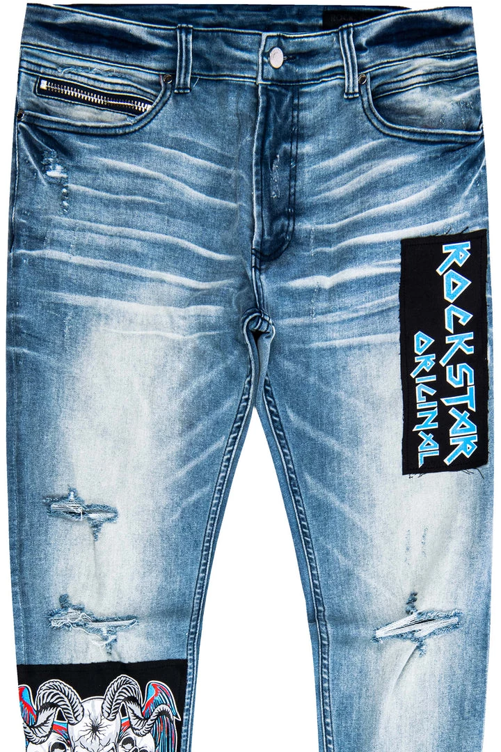 Rockstar Original Men’s denim featuring multi assorted patch designs with destroyed details. High quality zipper coin pocket.