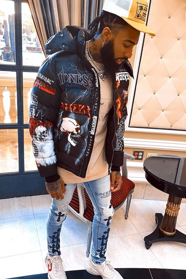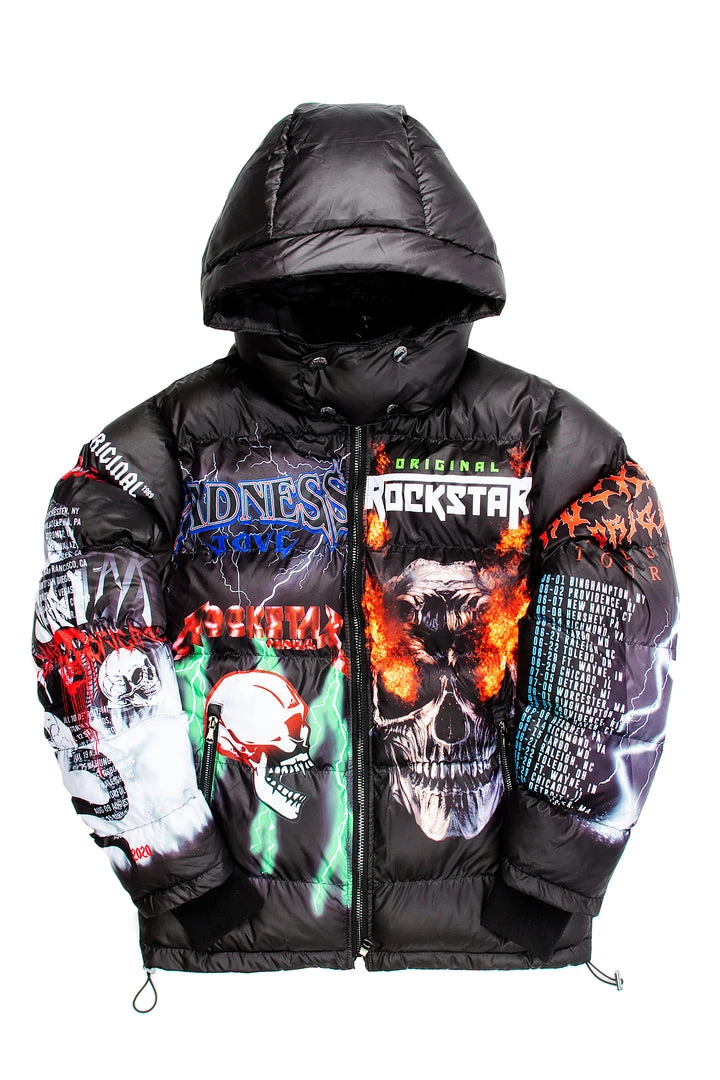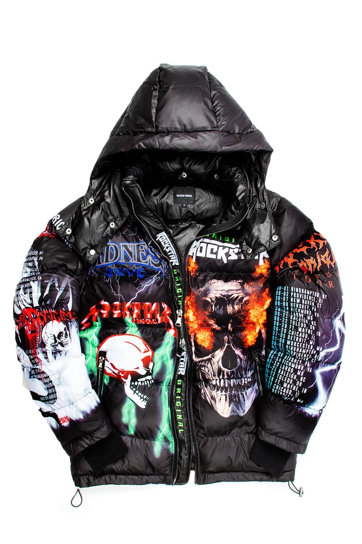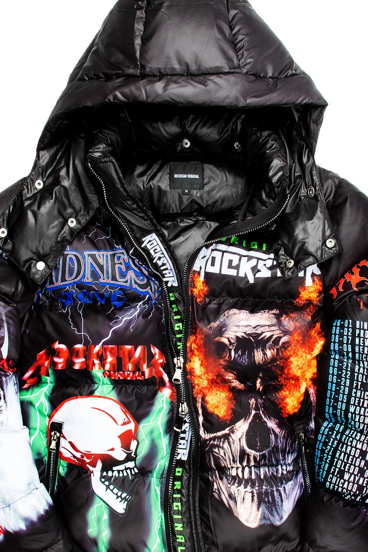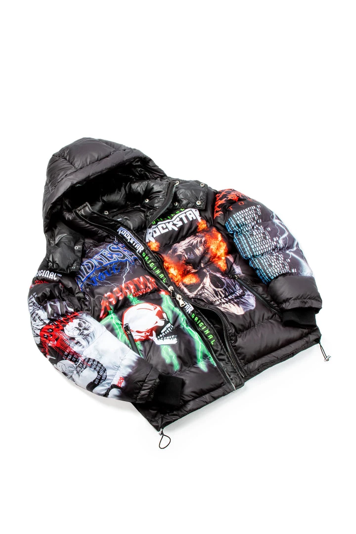 Rockstar Original Men’s puffer jacket in dramatic black. Featuring printed RSO logos with multi color graphics throughout to match. Accenting versatile material to keep you cool, comfortable and functional. This new must-have bubble coat is styled with a removable button hood, front zipper pockets and a high quality zipper closure.Â