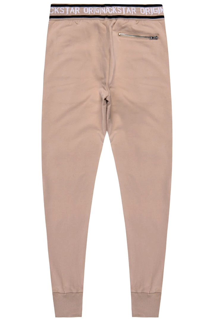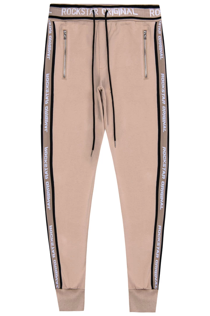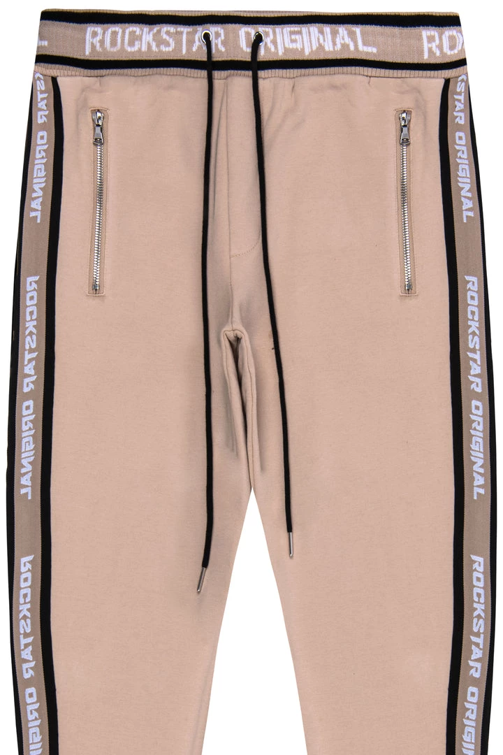 Rockstar Original men’s track pant featuring a relaxed fit with RSO logo on waistband and side pant with stripe details. Drawstring waistband with zipper pockets.