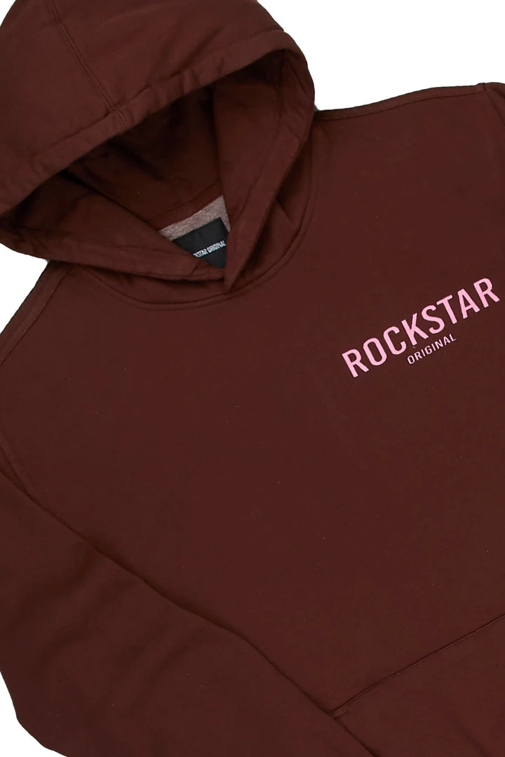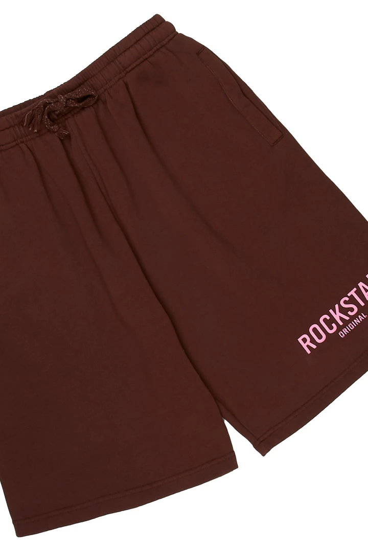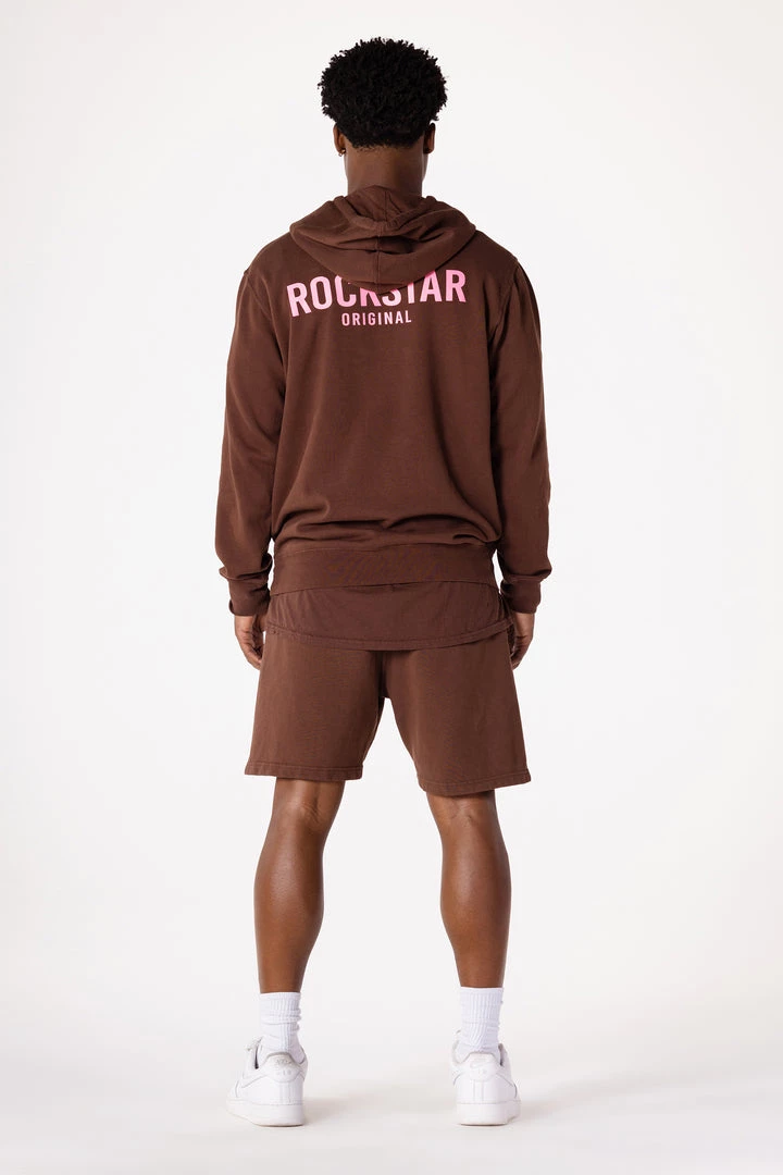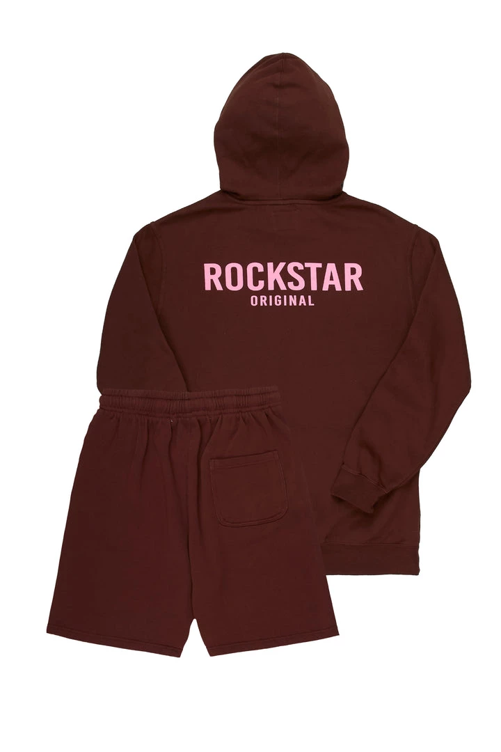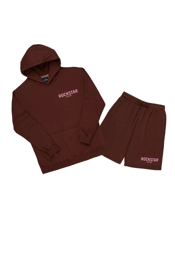 Rockstar Original Men’s two-piece essential short set in brown. Featuring clean RSO logos on the top and bottom. Top accents a drawstring hood and ribbed cuffs and hemline while bottoms accent a drawstring waistband, side pockets and ribbed cuffs. Designed with luxurious cotton for a super soft internal finish.