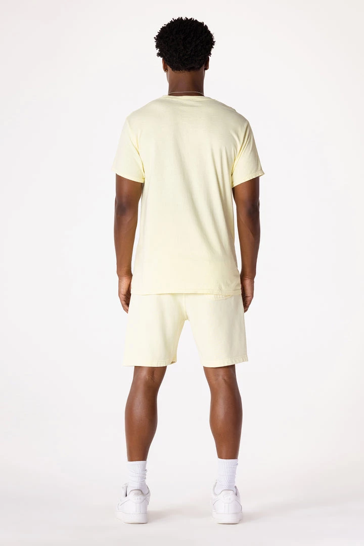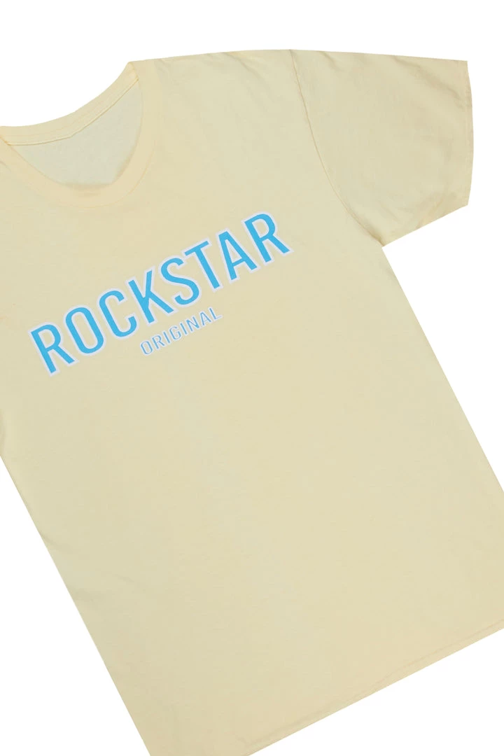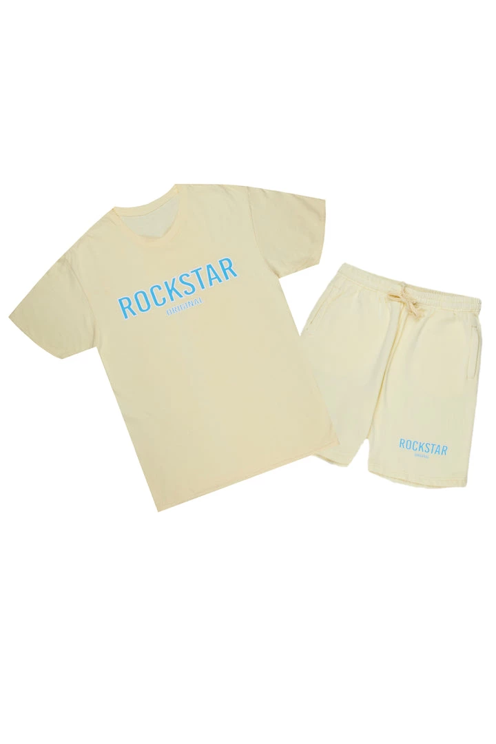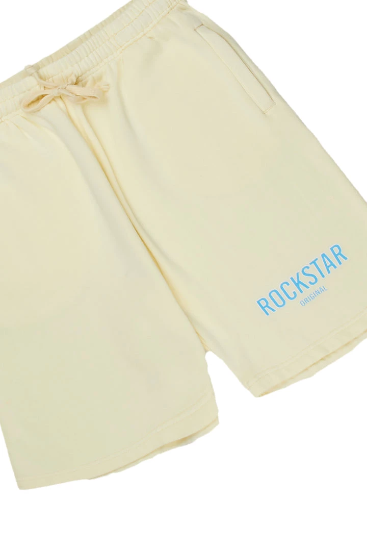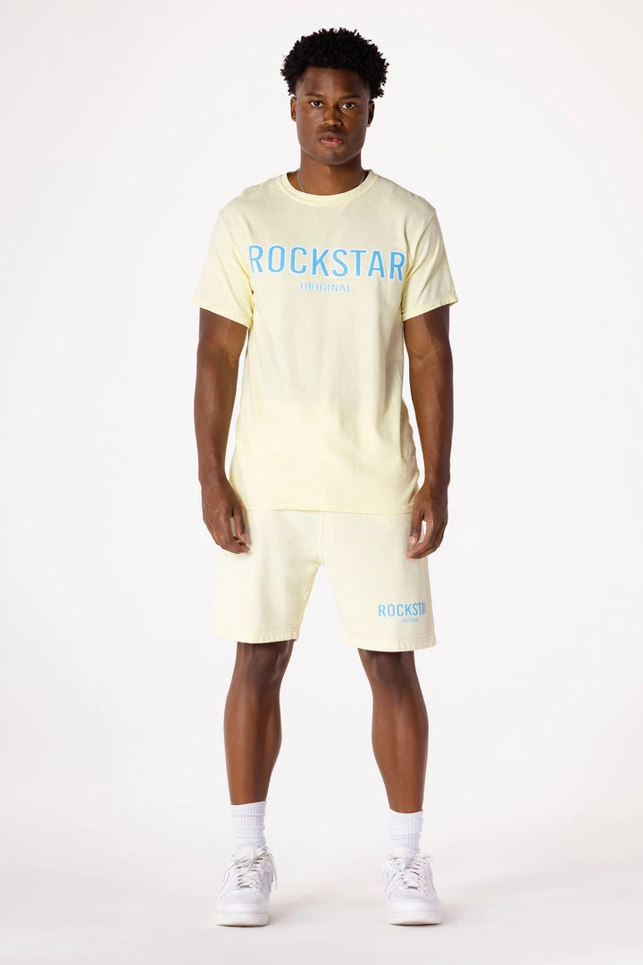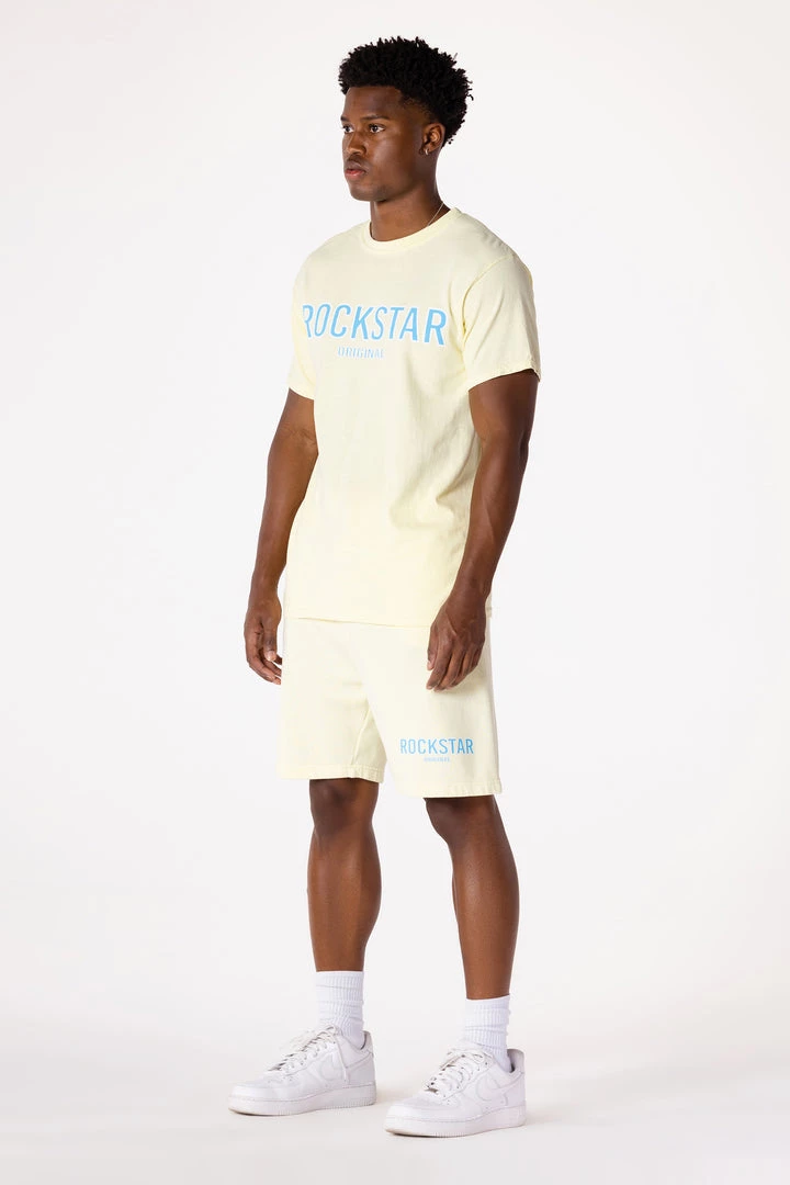Rockstar Original Men’s two-piece essential short set in yellow. Featuring clean RSO logos on the top and bottom. Tee accents a crew neckline with a relaxed fit while bottoms accent a drawstring waistband and side pockets. Designed with luxurious cotton for a super soft internal finish.