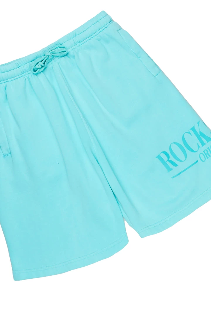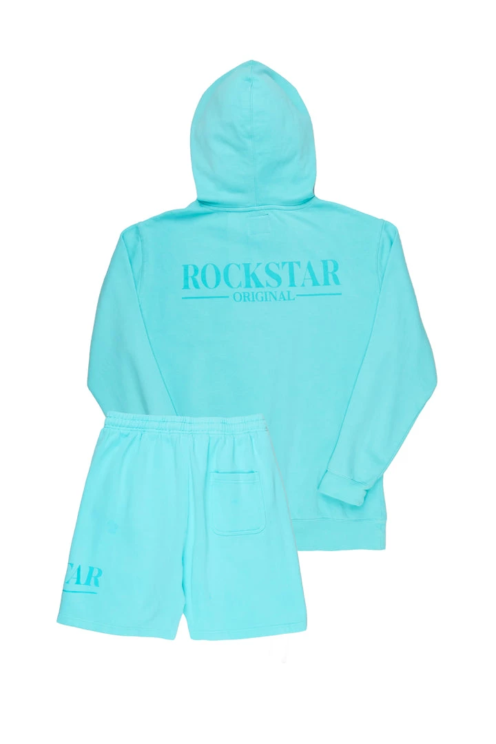 Rockstar Original Men’s two-piece essential short set in aqua. Featuring clean RSO logos on the top and bottom. Top accents a drawstring hood and ribbed cuffs and hemline while bottoms accent a drawstring waistband, side pockets and ribbed cuffs. Designed with luxurious cotton for a super soft internal finish.