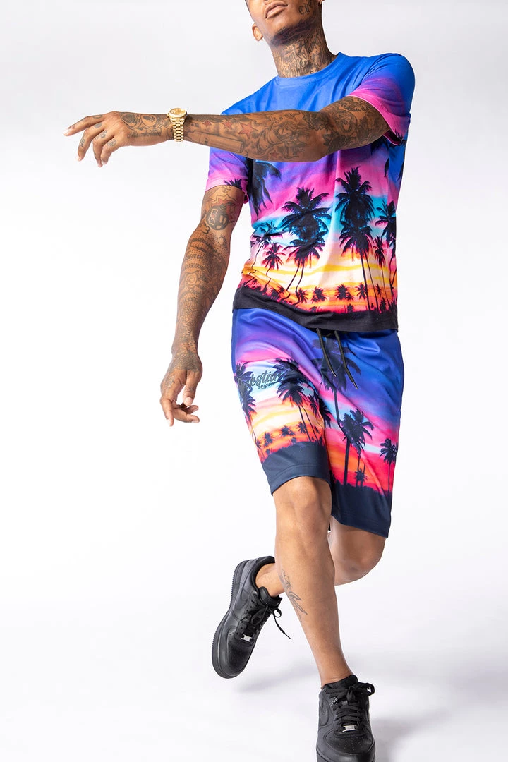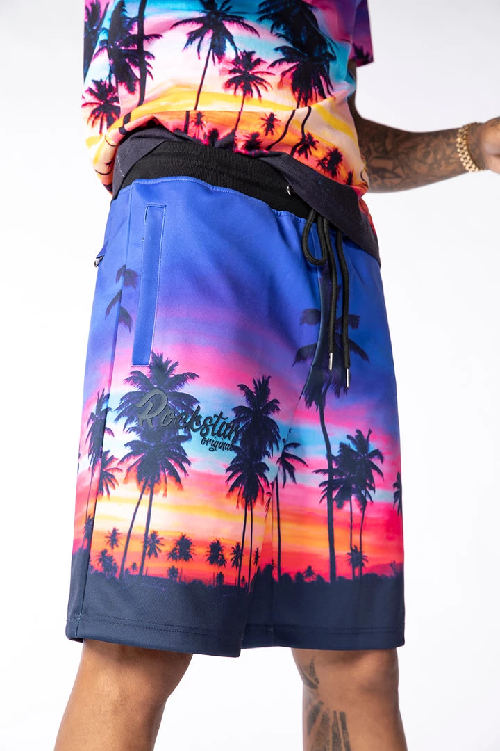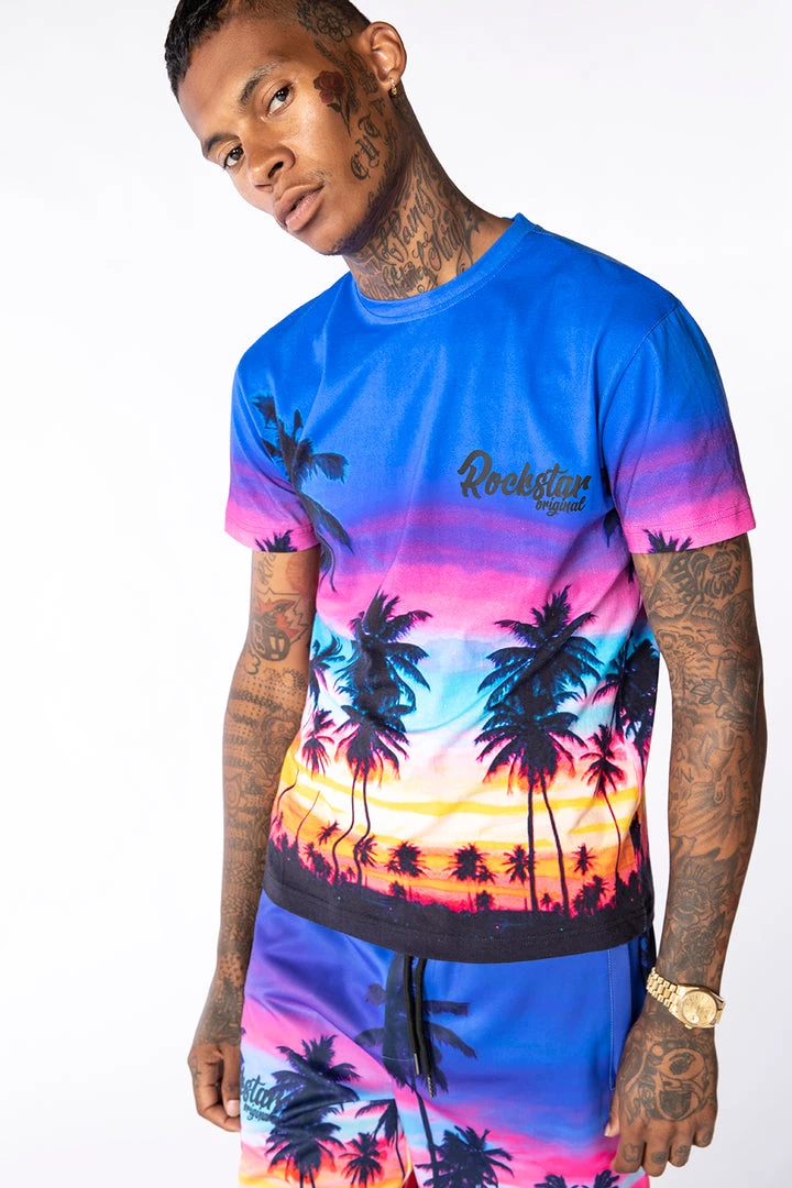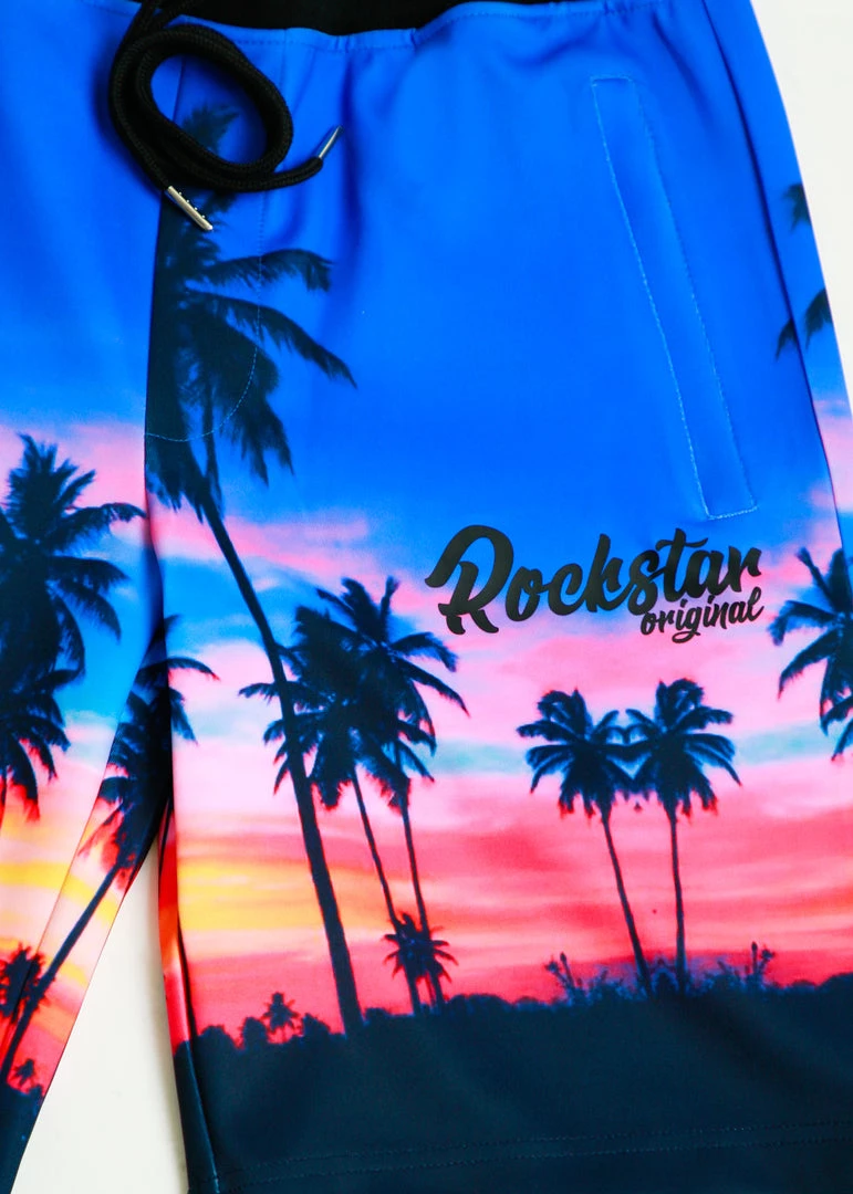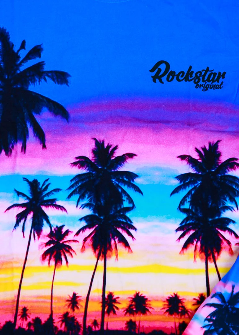 Rockstar Original Men’s two-piece short set in blue. Featuring printed RSO logos on the top and bottom with palm tree graphic designing throughout. Top accents a crew neckline and relaxed fit while bottoms accent a drawstring waistband with side pockets.