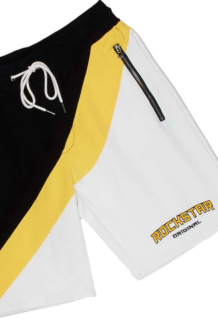 Rockstar Original Men’s two-piece short set in yellow. Featuring printed RSO logos with a color block design on the top and bottoms. Top accents a crewneck line, lightweight wear and premium cotton threading while bottoms accent a ribbed drawstring waistband with multiple pockets throughout for style and convenience.
