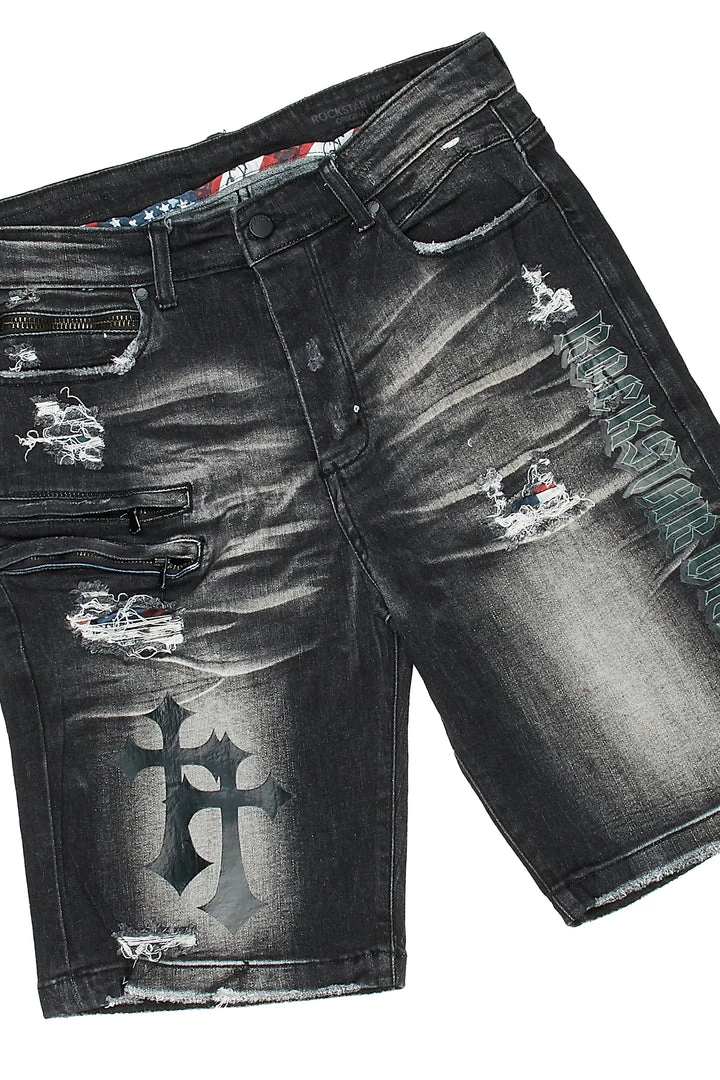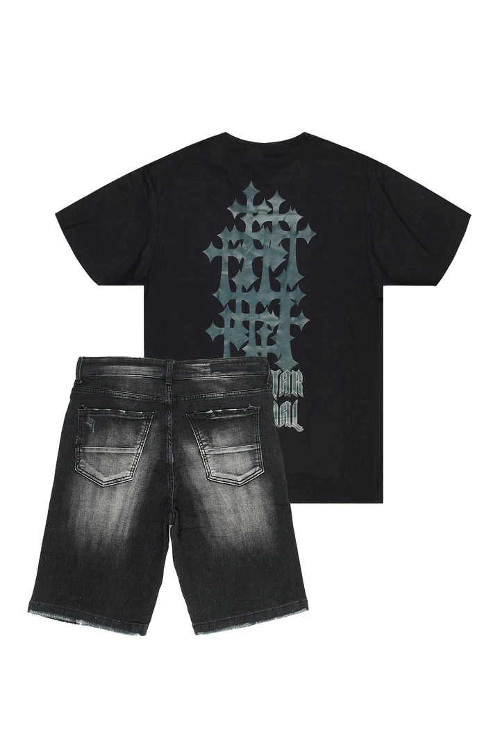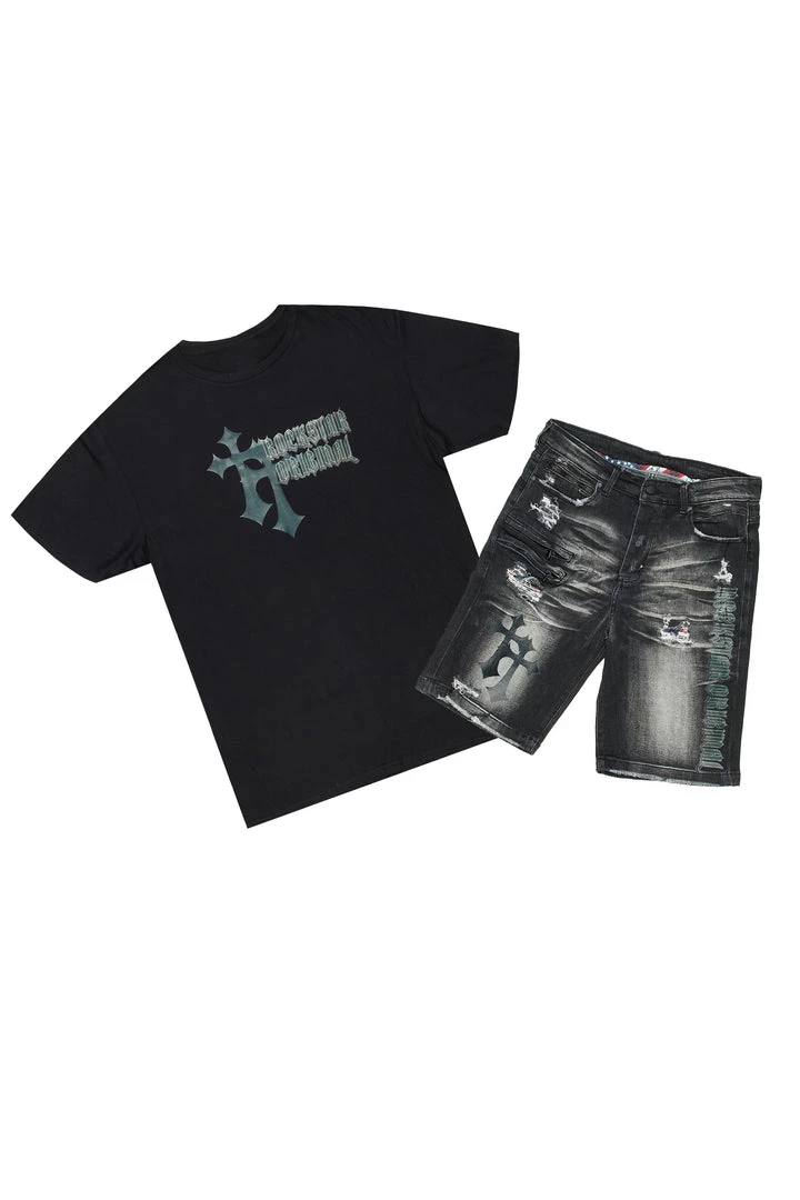 Rockstar Original Men’s denim short set in black. Featuring a crewneck tee and denim shorts with printed cross graphics throughout. Shorts accent a high quality zipper coin pocket with a front button closure, bleached detailing, raw hems and premium cotton threading for style and comfort.