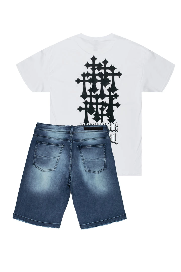 Rockstar Original Men’s denim short set in white. Featuring a crewneck tee and denim shorts in light wash with printed cross graphics throughout. Shorts accent a high quality zipper coin pocket with a front button closure, bleached detailing, raw hems and premium cotton threading for style and comfort.