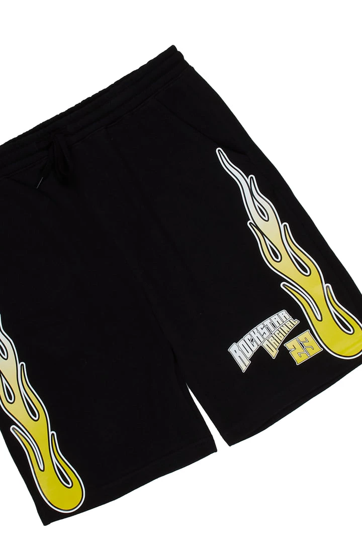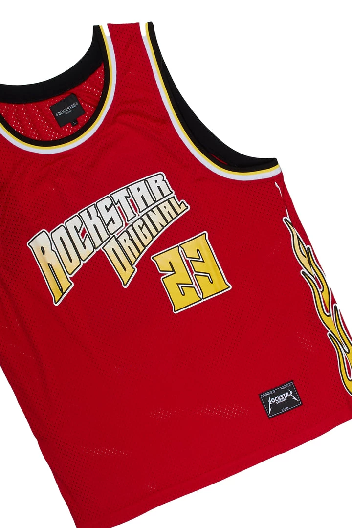 Rockstar Original Men’s two-piece short set in red. Featuring printed RSO logos on the top and bottoms with varsity graphics to match. Jersey accents rib knit sleeveless arms and neckline with mesh fabric while bottoms accent a ribbed drawstring waistband with pockets and a relaxed fit.