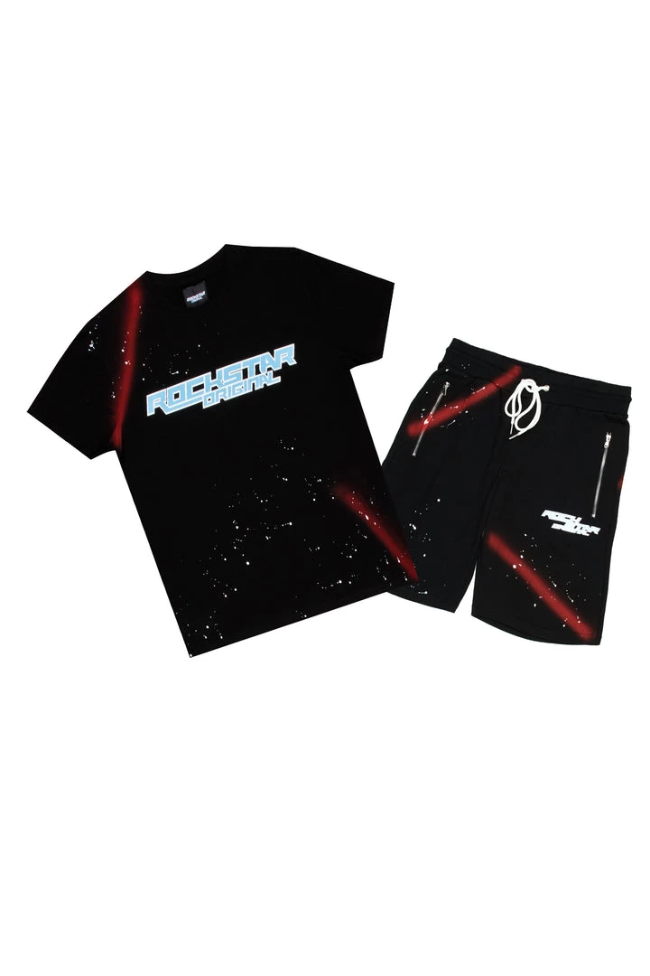 Rockstar Original Men’s two-piece short set in black. Featuring printed RSO logos on the top and bottom with custom splatter paint detailing throughout. Top accents a crew neckline with a relaxed fit while bottoms accent a ribbed drawstring waistband with side pockets and a relaxed fit.