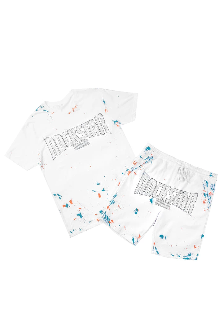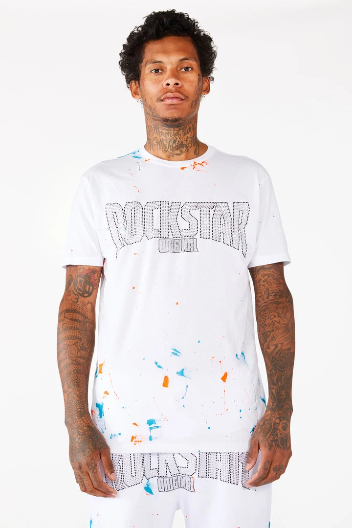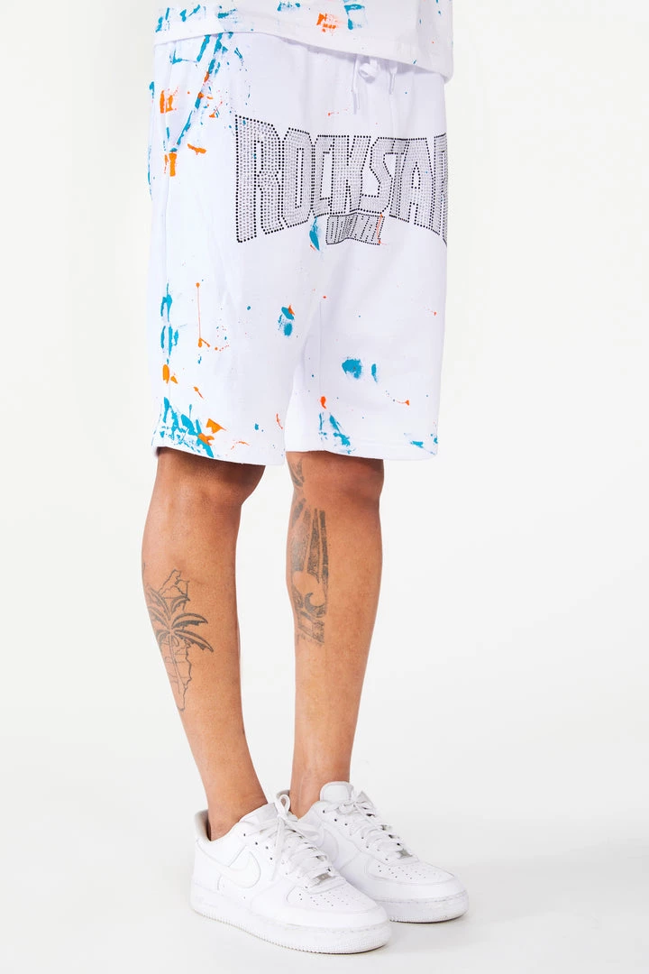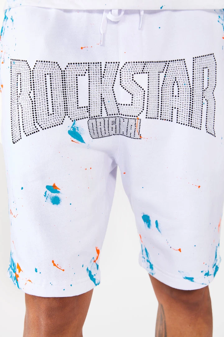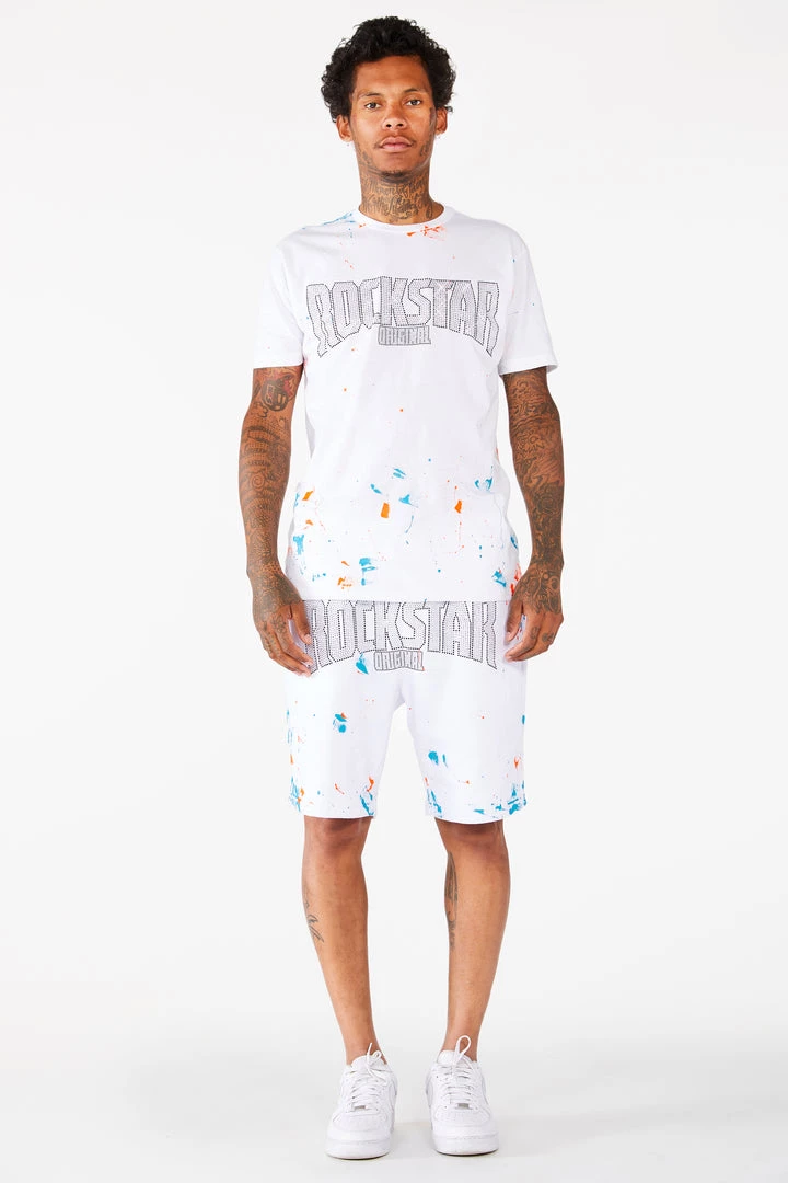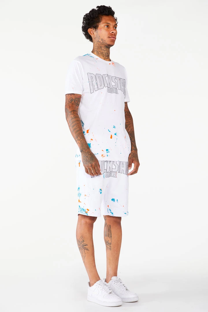 Rockstar Original men’s short tracksuit set featuring a two-piece tee and shorts. Tee and Shorts feature a crystal designed RSO logo with paint splatter all throughout. Shorts feature’s a drawstring waistband with zipper pockets.