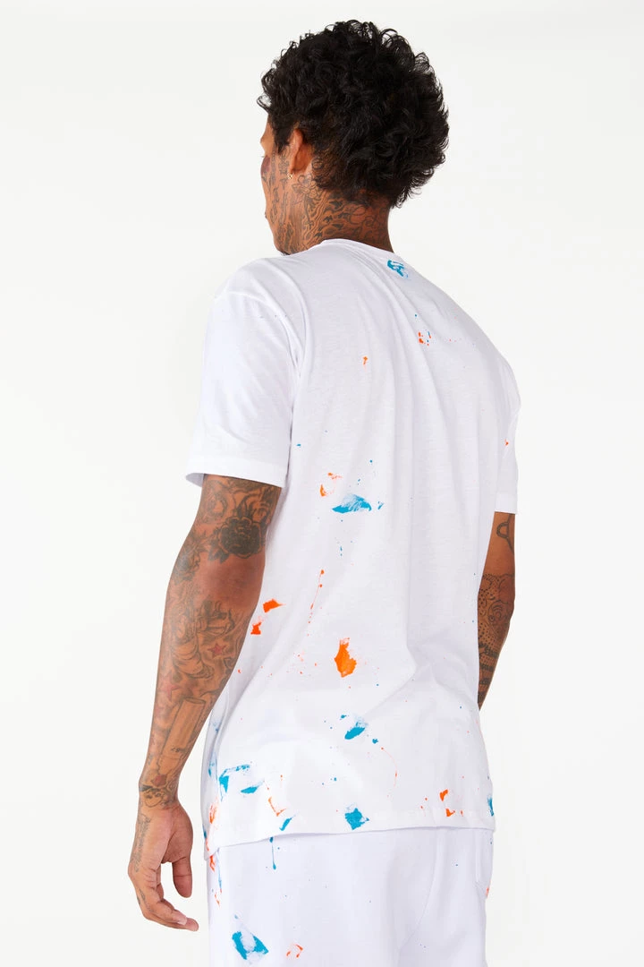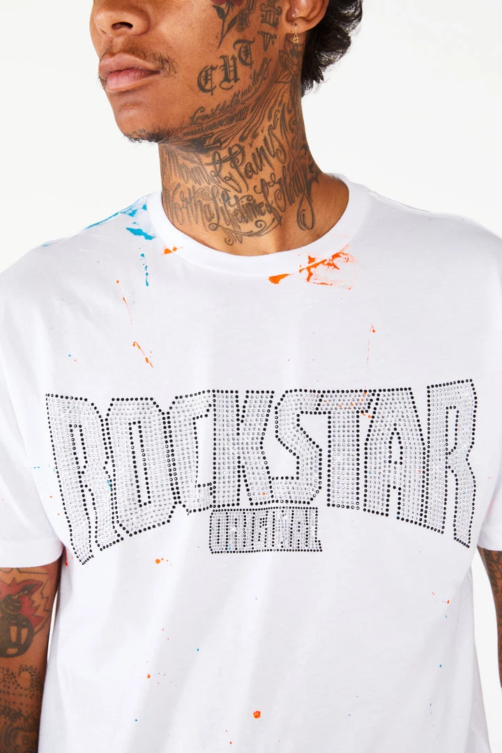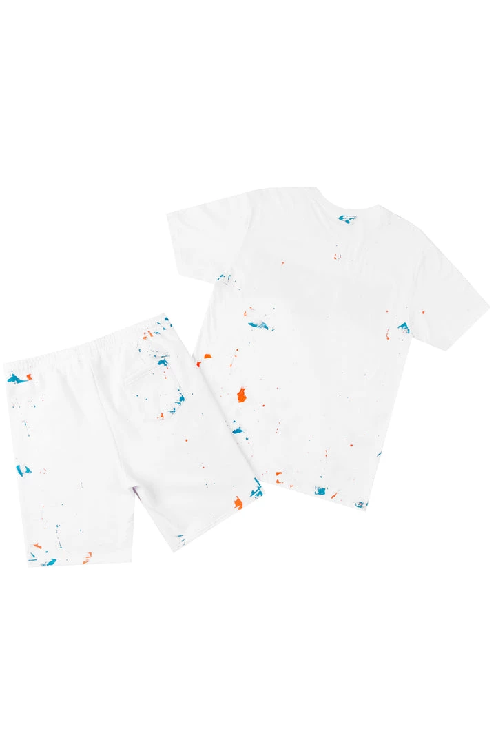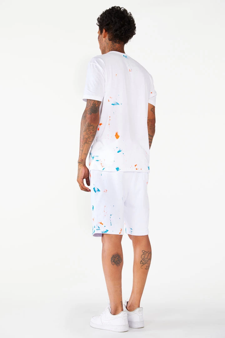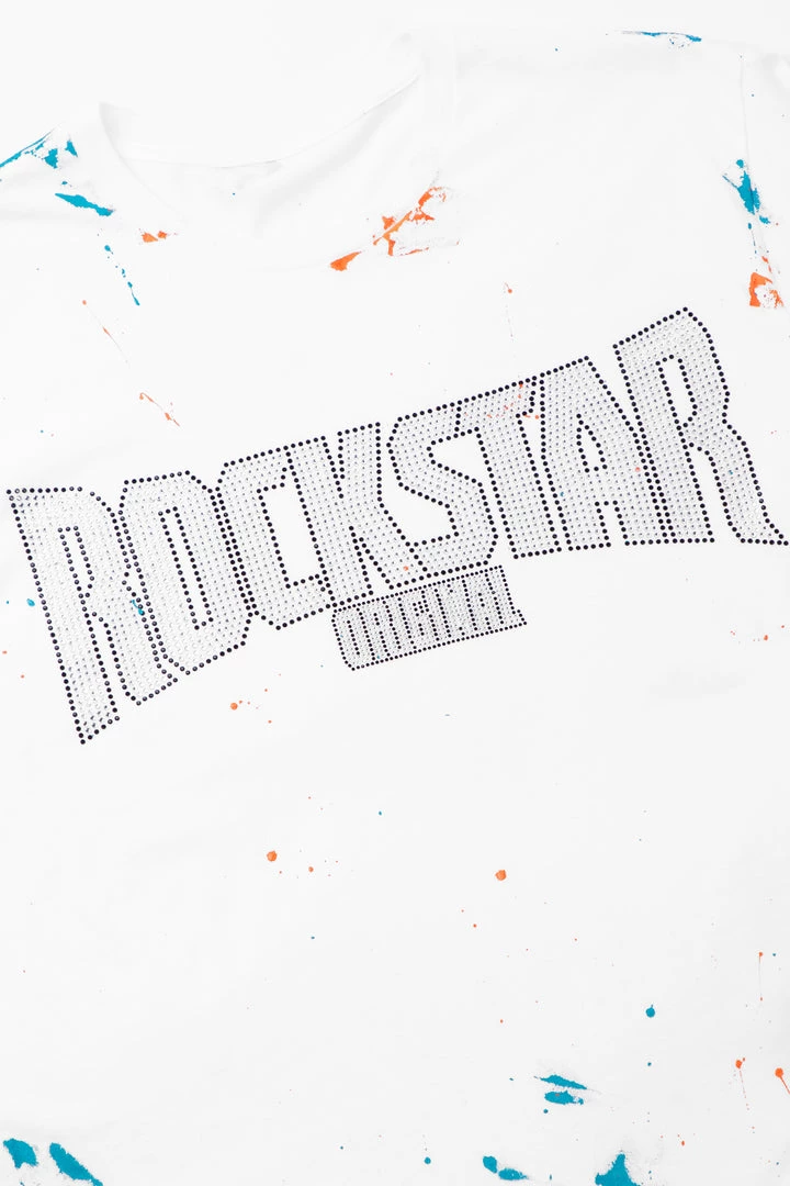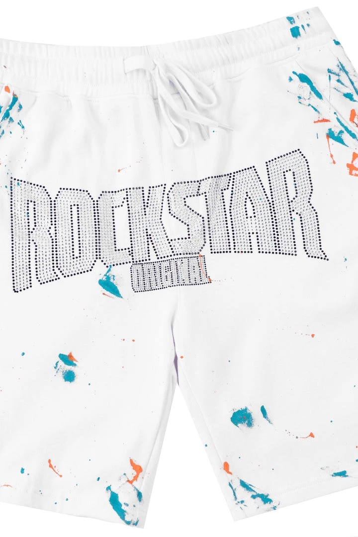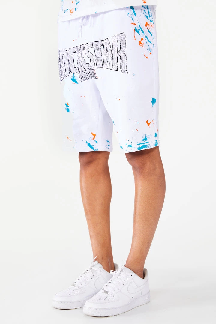 Rockstar Original men’s short tracksuit set featuring a two-piece tee and shorts. Tee and Shorts feature a crystal designed RSO logo with paint splatter all throughout. Shorts feature’s a drawstring waistband with zipper pockets.