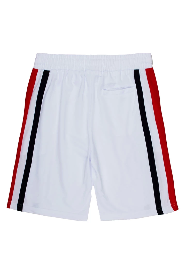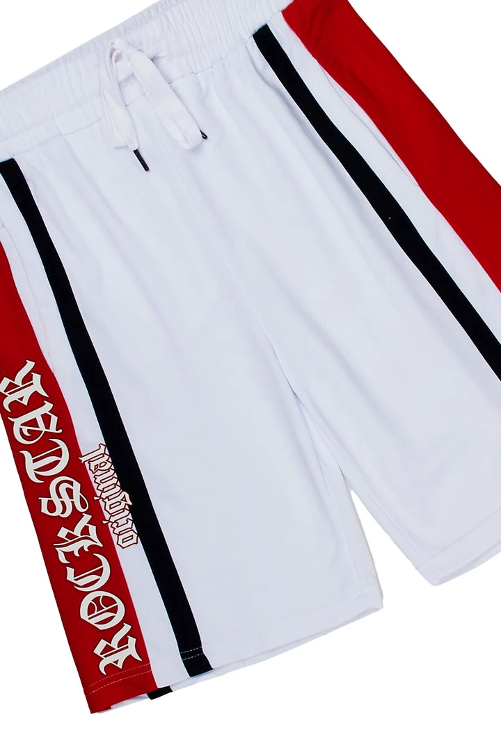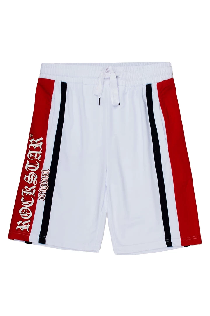 Rockstar Original Men’s shorts in white. Featuring printed RSO logos with color block designing. Accenting an elastic drawstring waistband and pockets for a comfortable and convenient staple piece.