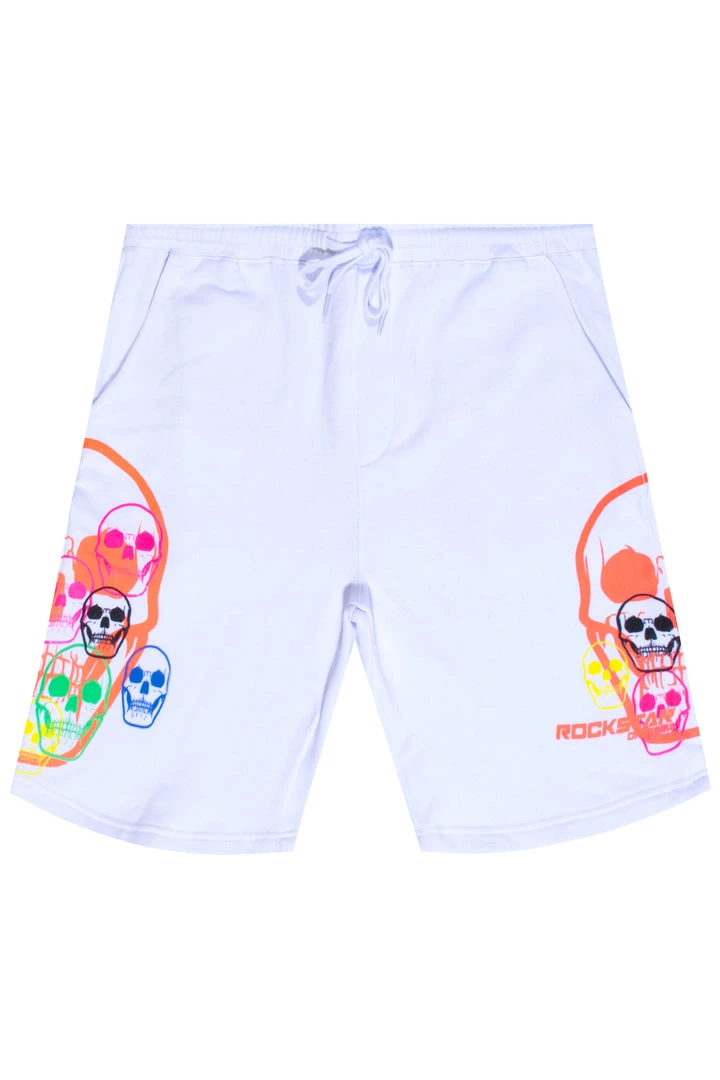Rockstar Original men’s shorts featuring a graphic printed RSO logo with assorted printed skulls. Drawstring waistband and front pockets.