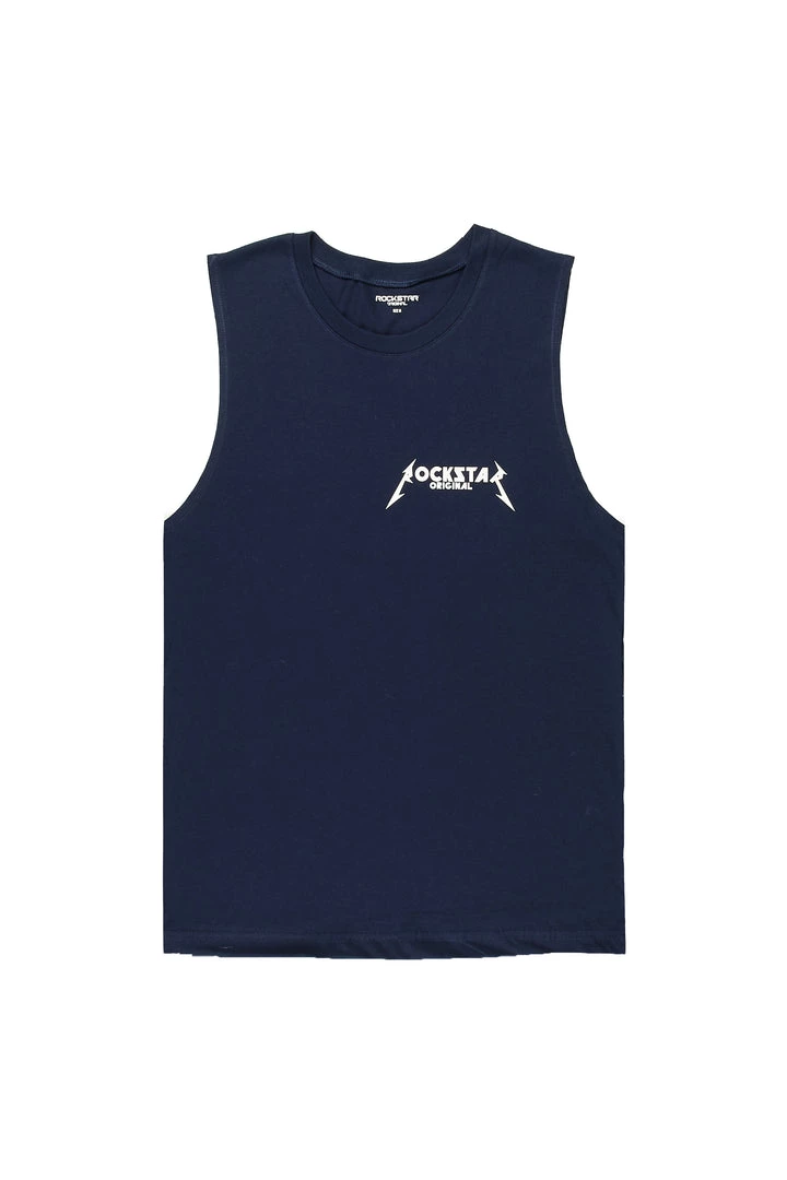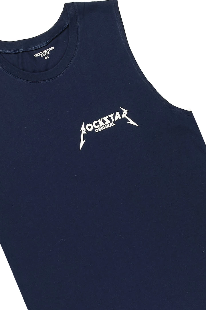 Rockstar Original Men’s tank in navy blue. Featuring a printed RSO logo across the chest with a crew neckline and relaxed fit. This essential tank top is made with premium cotton threading for all day comfort.