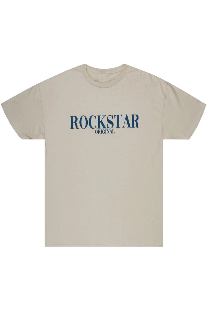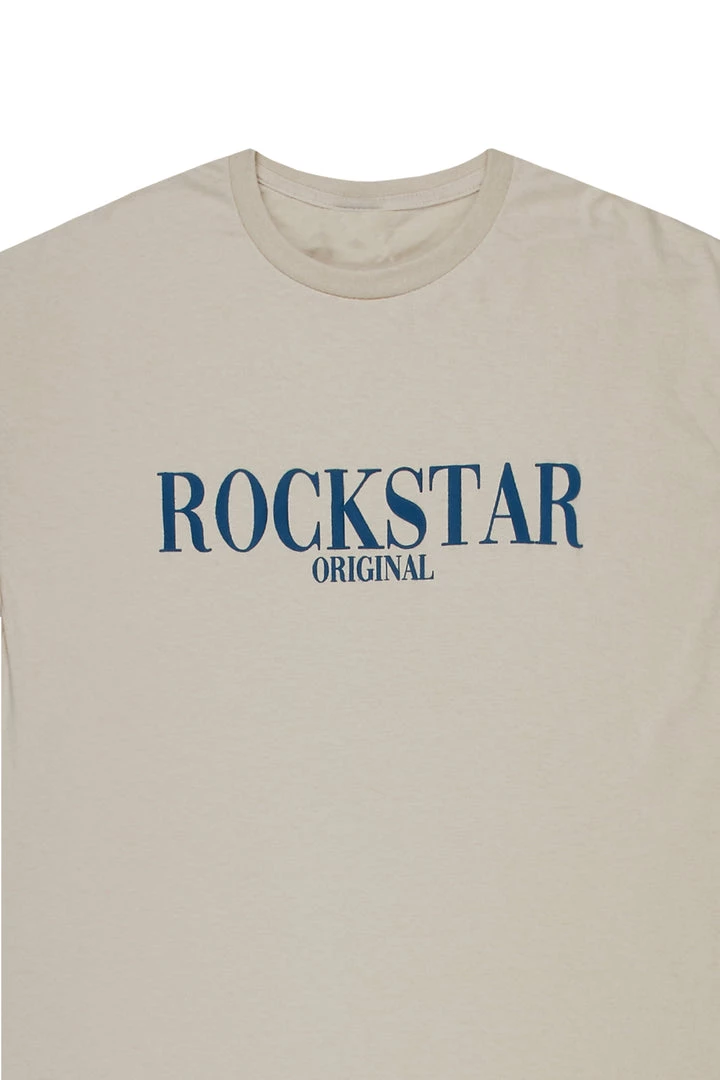 Rockstar Original Men’s tee in beige. Featuring a velvet flocking RSO logo, crew neckline and relaxed fit. This essential tee is made with premium cotton threading for all day comfort.