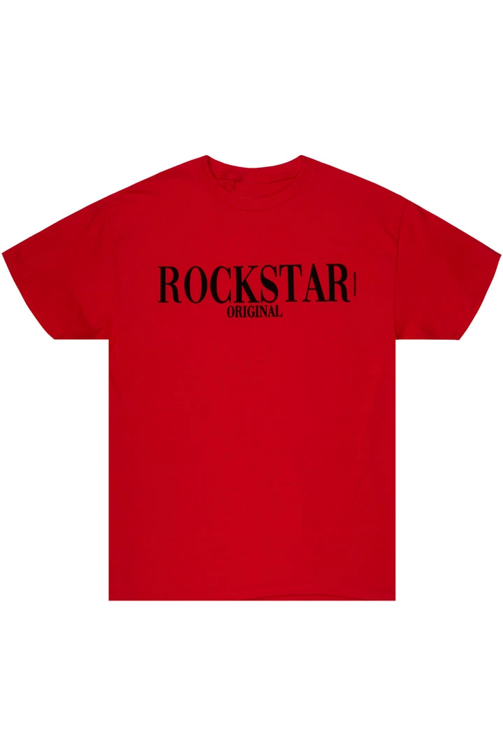 Rockstar Original Men’s tee in red. Featuring a velvet flocking RSO logo, crew neckline and relaxed fit. This essential tee is made with premium cotton threading for all day comfort.