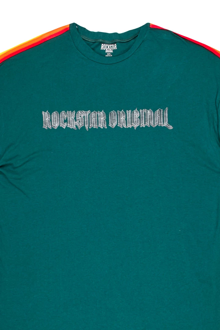 Rockstar Original Men’s tee in white. Featuring a printed RSO logo with a rainbow stripe design on the shoulders. Accenting a crew neckline with short sleeves and a relaxed fit.