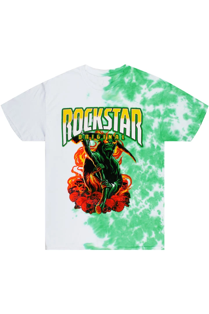 Rockstar Original Men’s tee in green. Featuring a printed RSO logo with a grim reaper graphic. Accenting a tie-dye split design with a crew neckline, short sleeves and a relaxed fit.