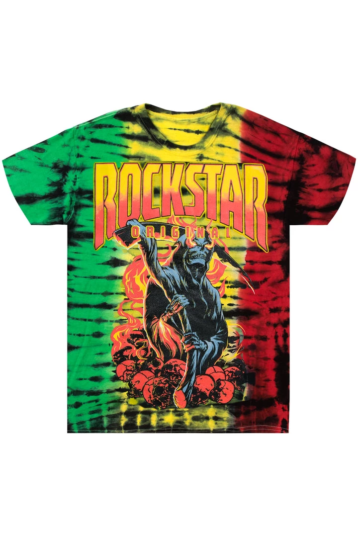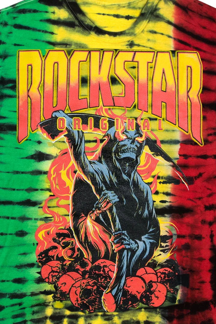 Rockstar Original men’s tee featuring a graphic printed RSO logo with a grim reaper. Tie dye wash all over.