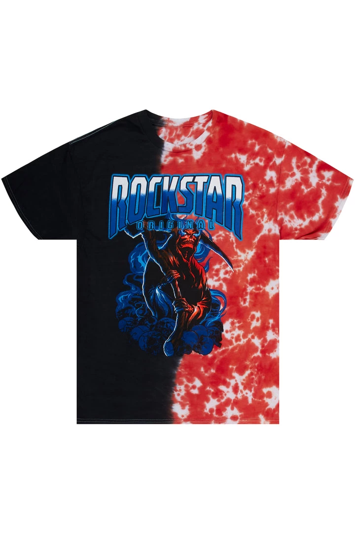 Rockstar Original Men’s tee in red. Featuring a printed RSO logo with a grim reaper graphic. Accenting a tie-dye split design with a crew neckline, short sleeves and a relaxed fit.