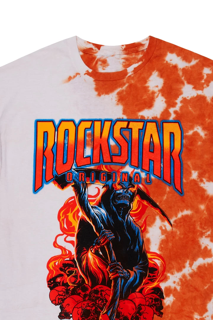 Rockstar Original Men’s tee in white. Featuring a printed RSO logo with a grim reaper graphic. Accenting a tie-dye split design with a crew neckline, short sleeves and a relaxed fit.