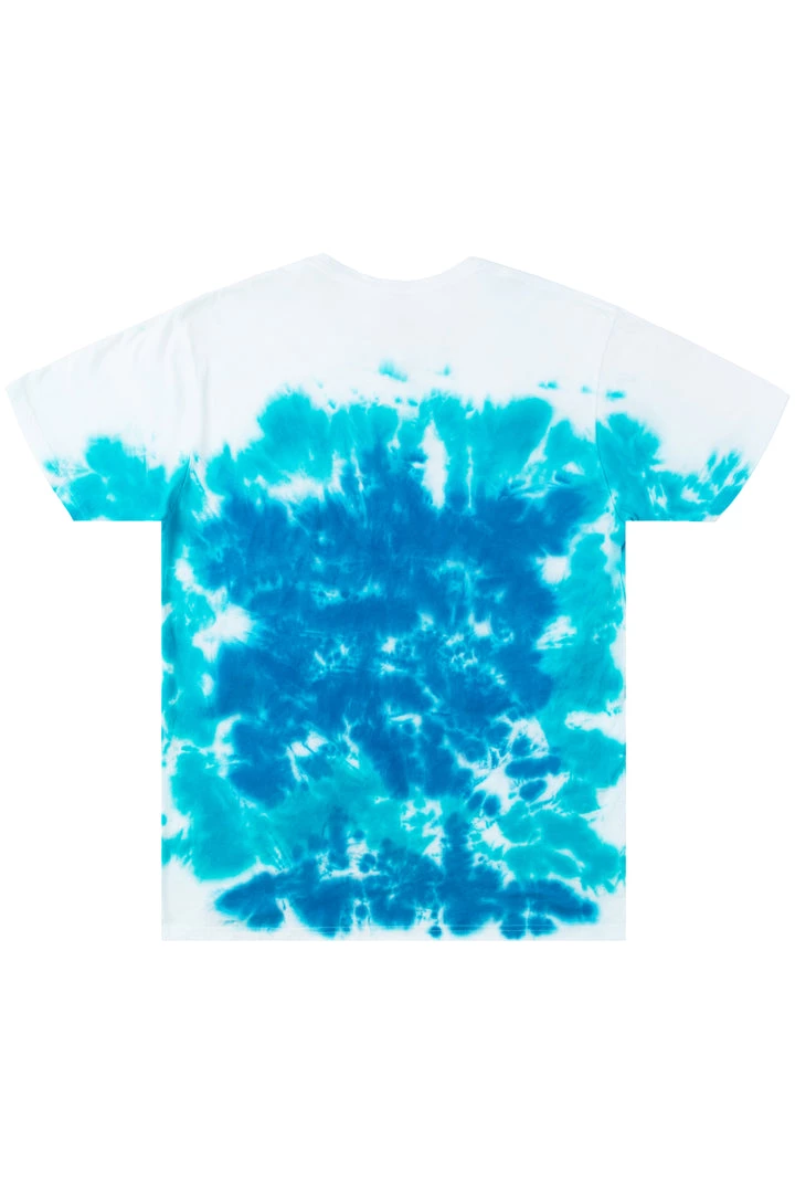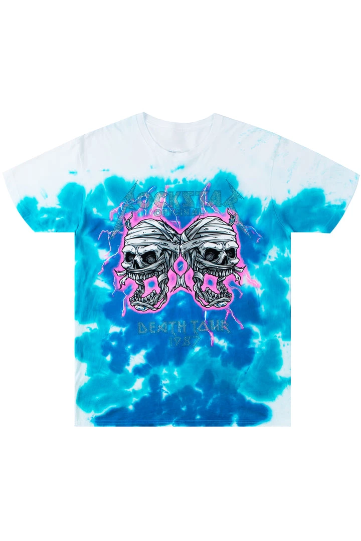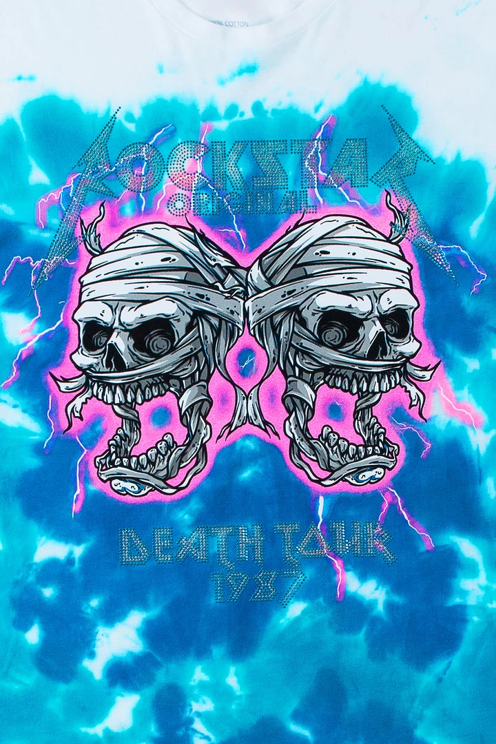 Rockstar Original Men’s t-shirt in white. Featuring a rhinestone RSO logo with multi colored tie dye wash all over. Accenting a mummy skull graphic print across the chest with premium cotton threading.