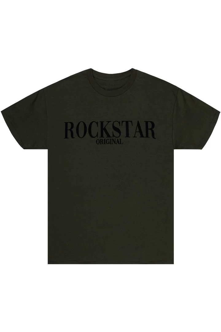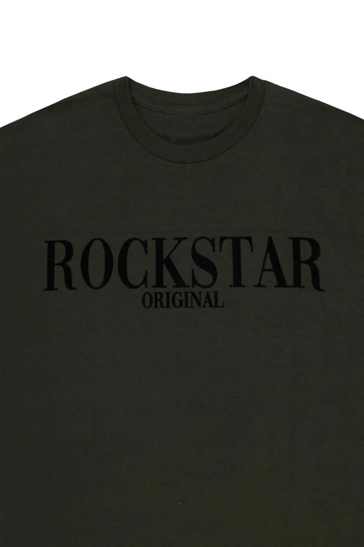 Rockstar Original Men’s tee in green. Featuring a velvet flocking RSO logo, crew neckline and relaxed fit. This essential tee is made with premium cotton threading for all day comfort.
