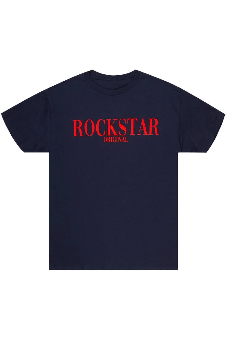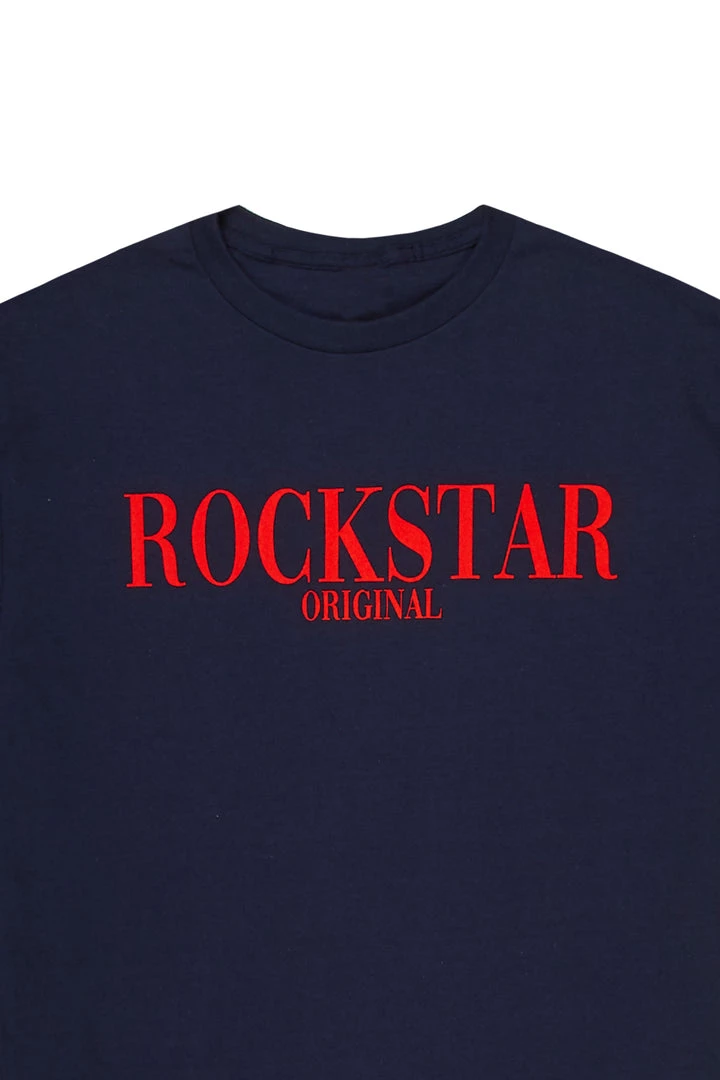 Rockstar Original Men’s tee in navy. Featuring a velvet flocking RSO logo, crew neckline and relaxed fit. This essential tee is made with premium cotton threading for all day comfort.