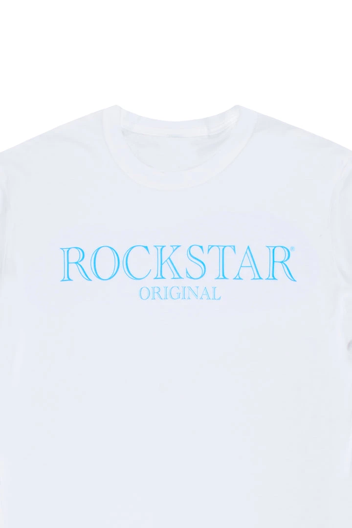 Rockstar Original Men’s tee in white. Featuring a printed RSO logo across the chest. This unique tee accents a crewneck line, lightweight wear and premium cotton threading for style and comfort.