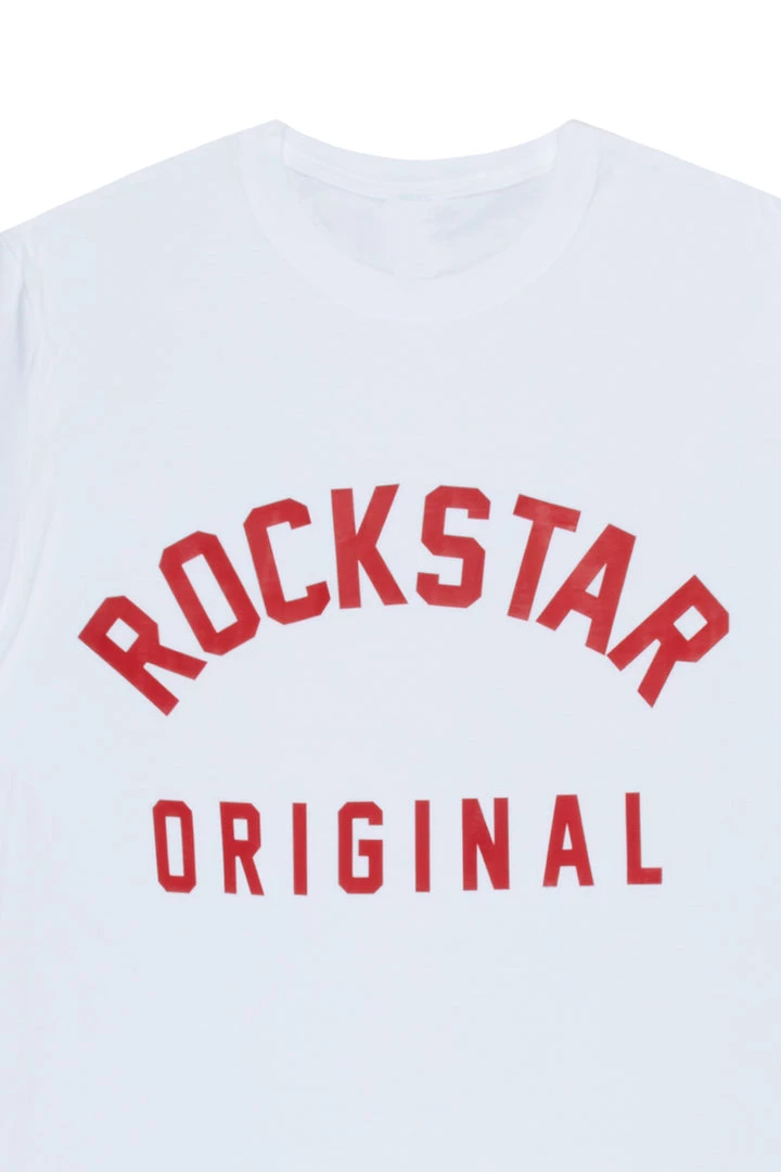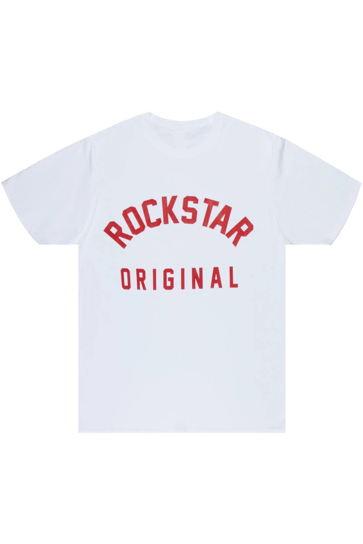 Rockstar Original Men’s tee in white. Featuring a printed RSO logo across the chest. This unique tee accents a crewneck line, lightweight wear and premium cotton threading for style and comfort.Â