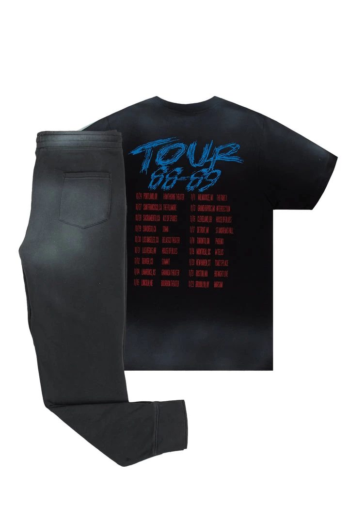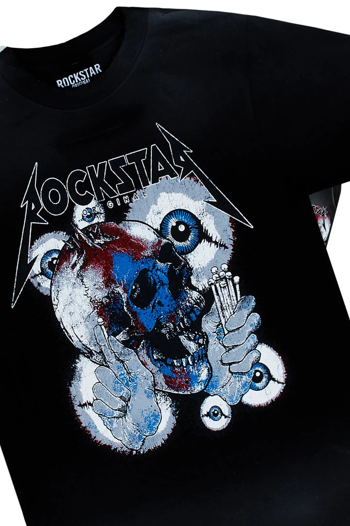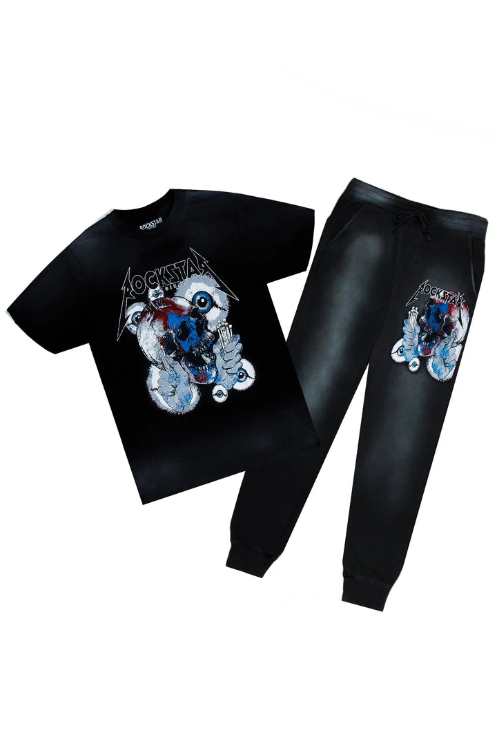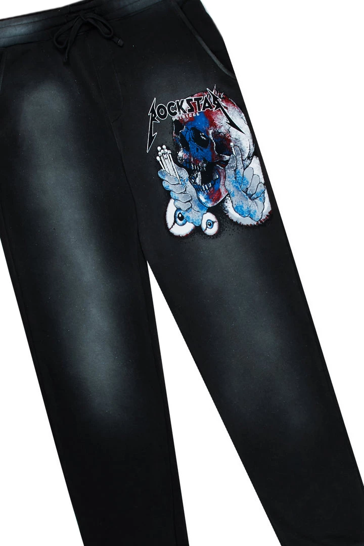 Rockstar Original Men’s vintage style jogger set in black. Featuring printed RSO logos and multi color skull graphics to match on the top and bottom. Top accents a crew neckline with distressed details and a bleached finish while bottoms accent a drawstring waistband with side pockets and rib knit cuffs. Designed with premium cotton threading for all day comfort.